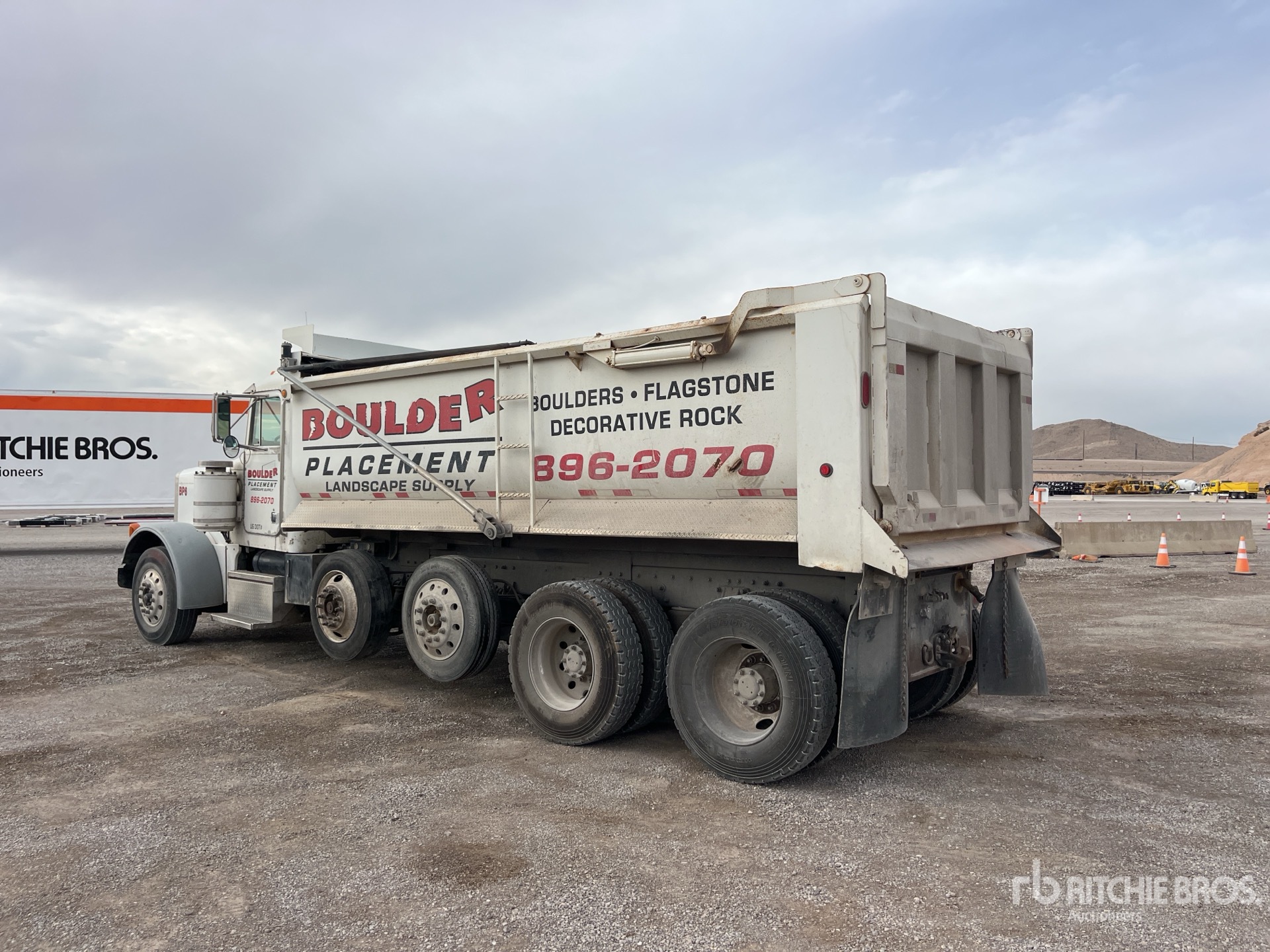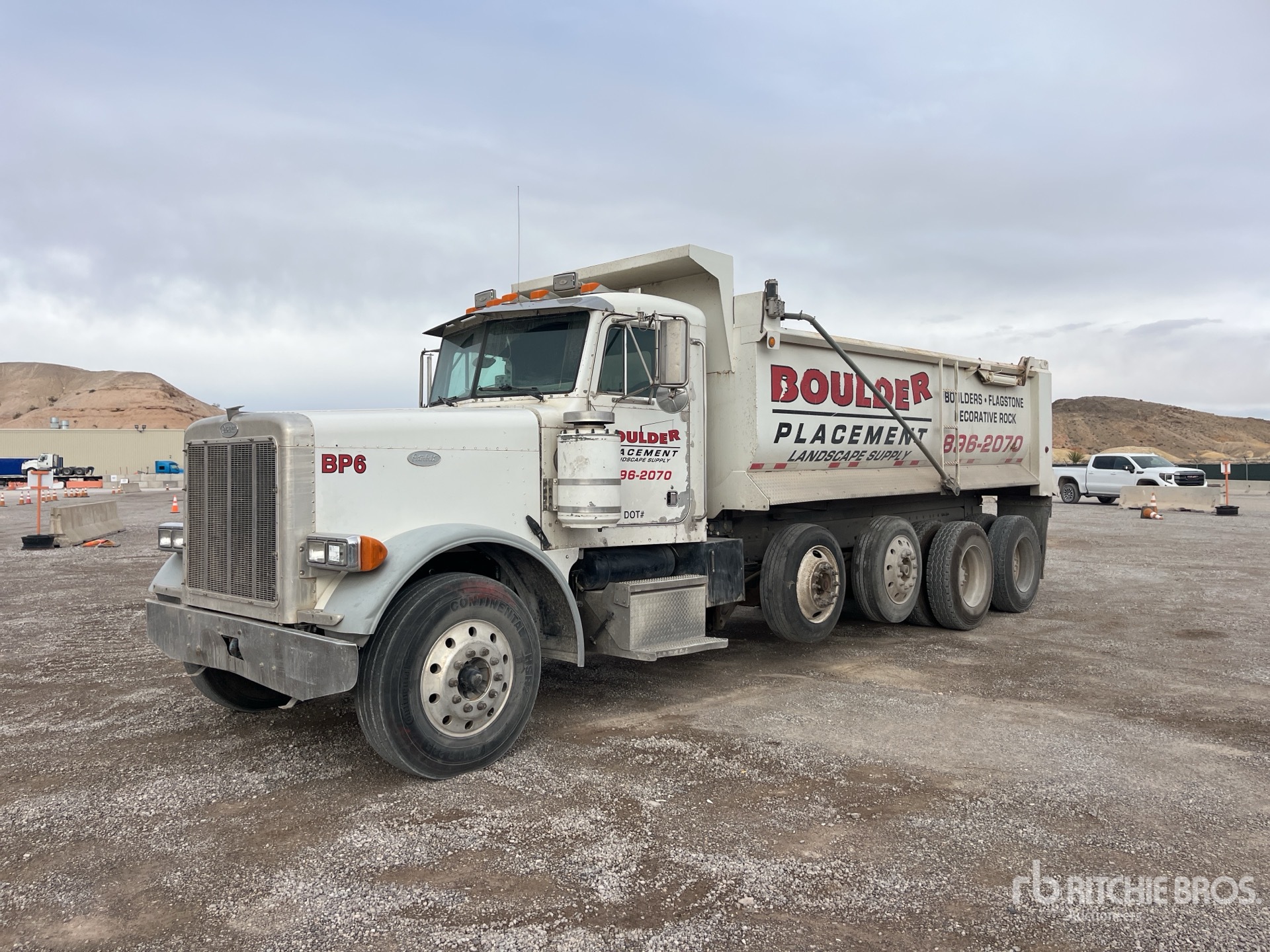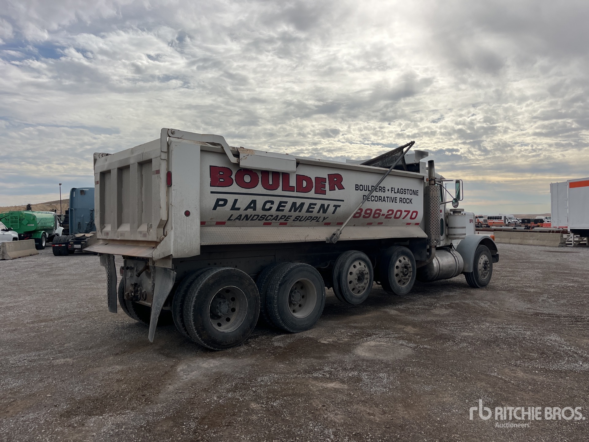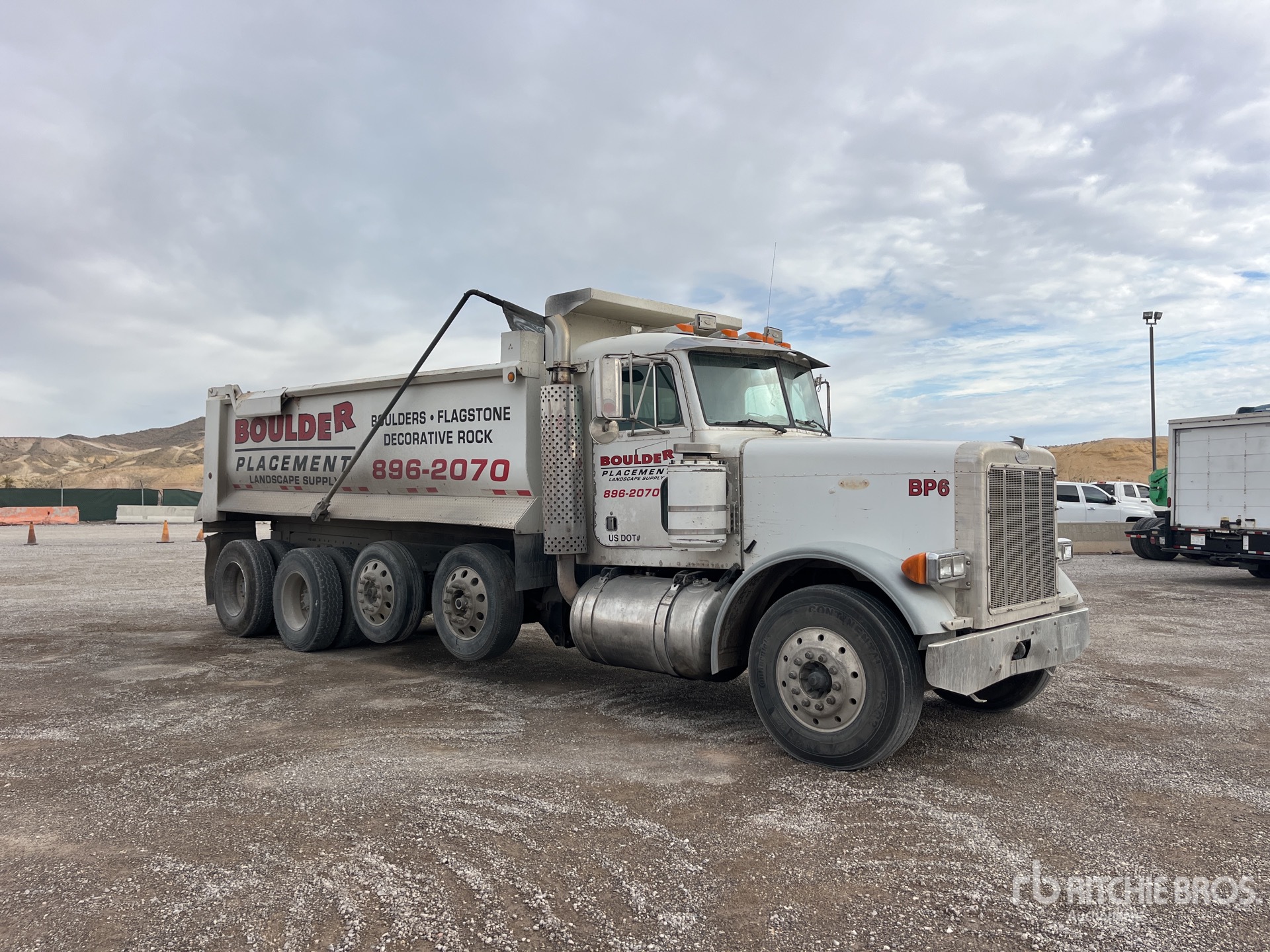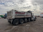 Cummins N14 6 Cylinder Diesel Engine, Engine Brake, Eaton Fuller Manual Transmission, 12000 lb Front Axle, 36000 lb Rears, 48000 lb GVWR, 11R22.5 Front Tires, 11R22.5 Rear Tires, 2 Air Lift Pusher Axles, Air Ride Suspension, 268 in Wheelbase, PTO, 18 ft Long x 4 ft High Steel Body, Round Bottom, Electric Roll Tarp, Pintle Hitch
