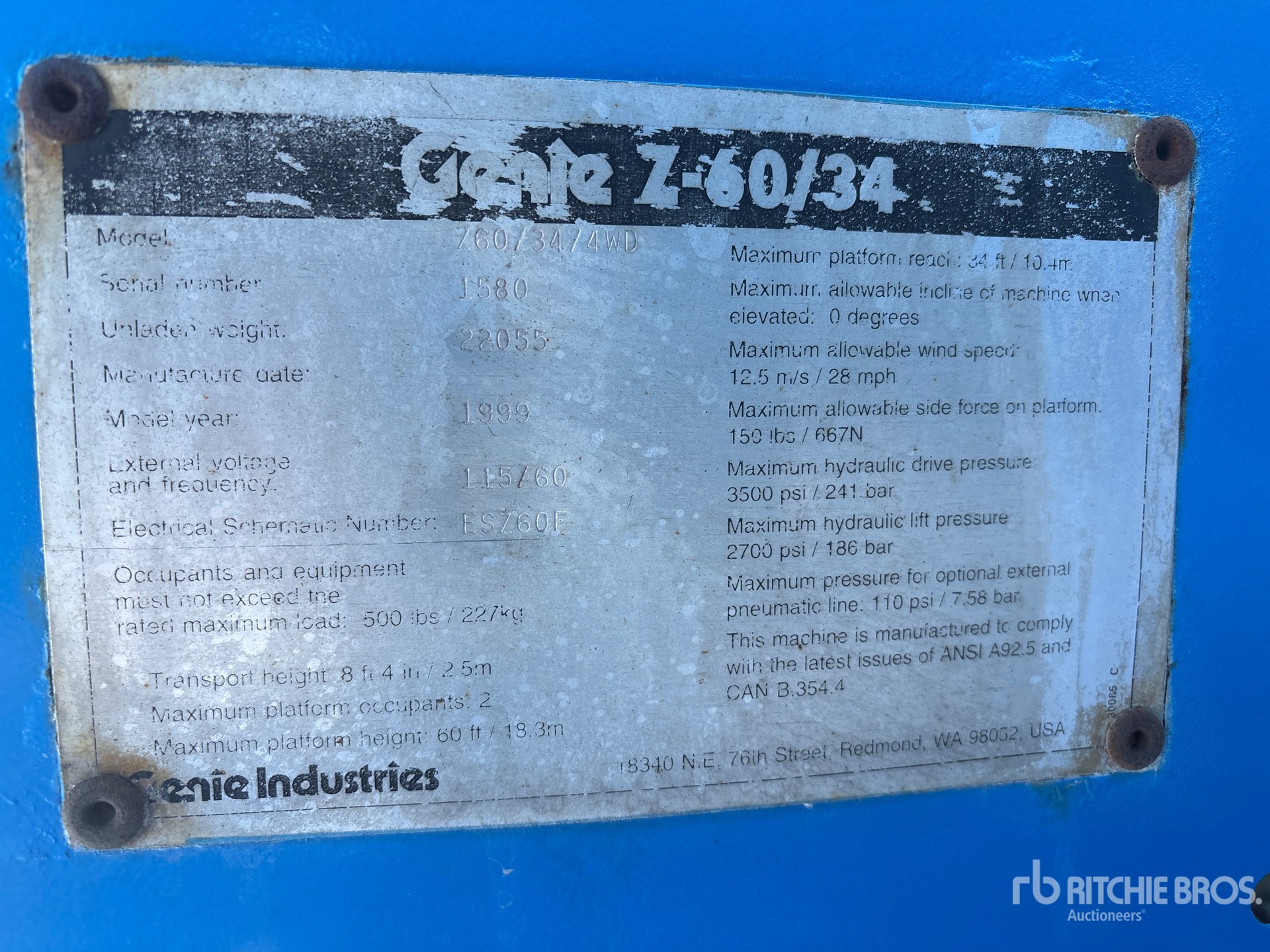 详细的设备信息范围有限,且除本文明确列出的方面或组件外,利氏兄弟拍卖公司并未检查设备中的任何其他方面或组件。除非另有明确声明,我们不会对设备或其组件作出任何形式的明示或暗示的陈述或保证。这包括但不限于关于功能、符合或遵循任何适用权力机构或监管机构的安全标准或要求、适用于任何特定用途,或者适销性的任何陈述或保证。我们强烈建议您在竞拍之前自行对设备进行详细检查。