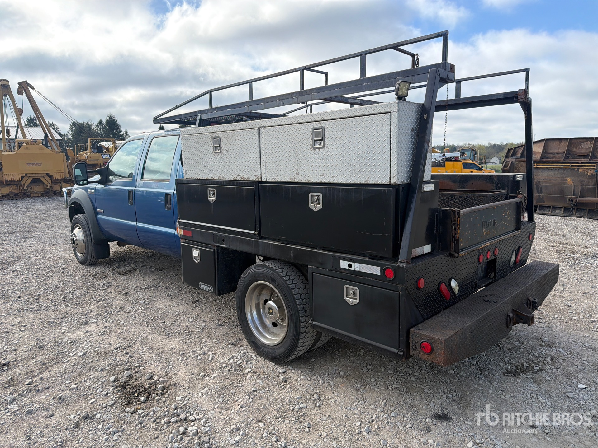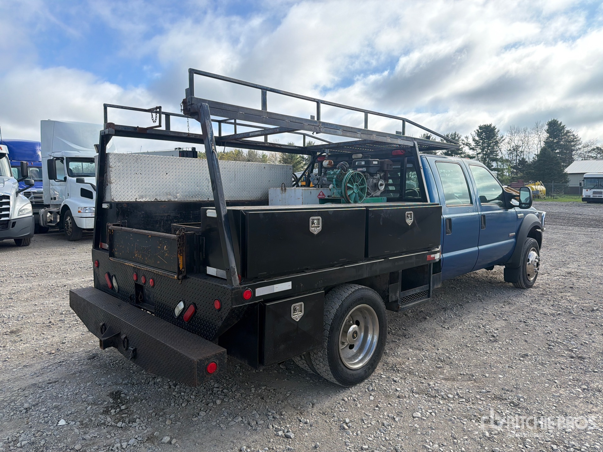 Ford Power stroke V8 7.3 L Diesel Engine, 7246.5 Engine hrs, Ford 5-Speed Manual Transmission, 6000 lb Front Axle, 13660 lb Rears, 17950 lb GVWR, 225/70R19.5 Front Tires, 225/70R19.5 Rear Tires, Ford Spring Suspension, 175 in Wheelbase, Buyers 9 ft 10 in Body, Champion Gasoline Air Compressor