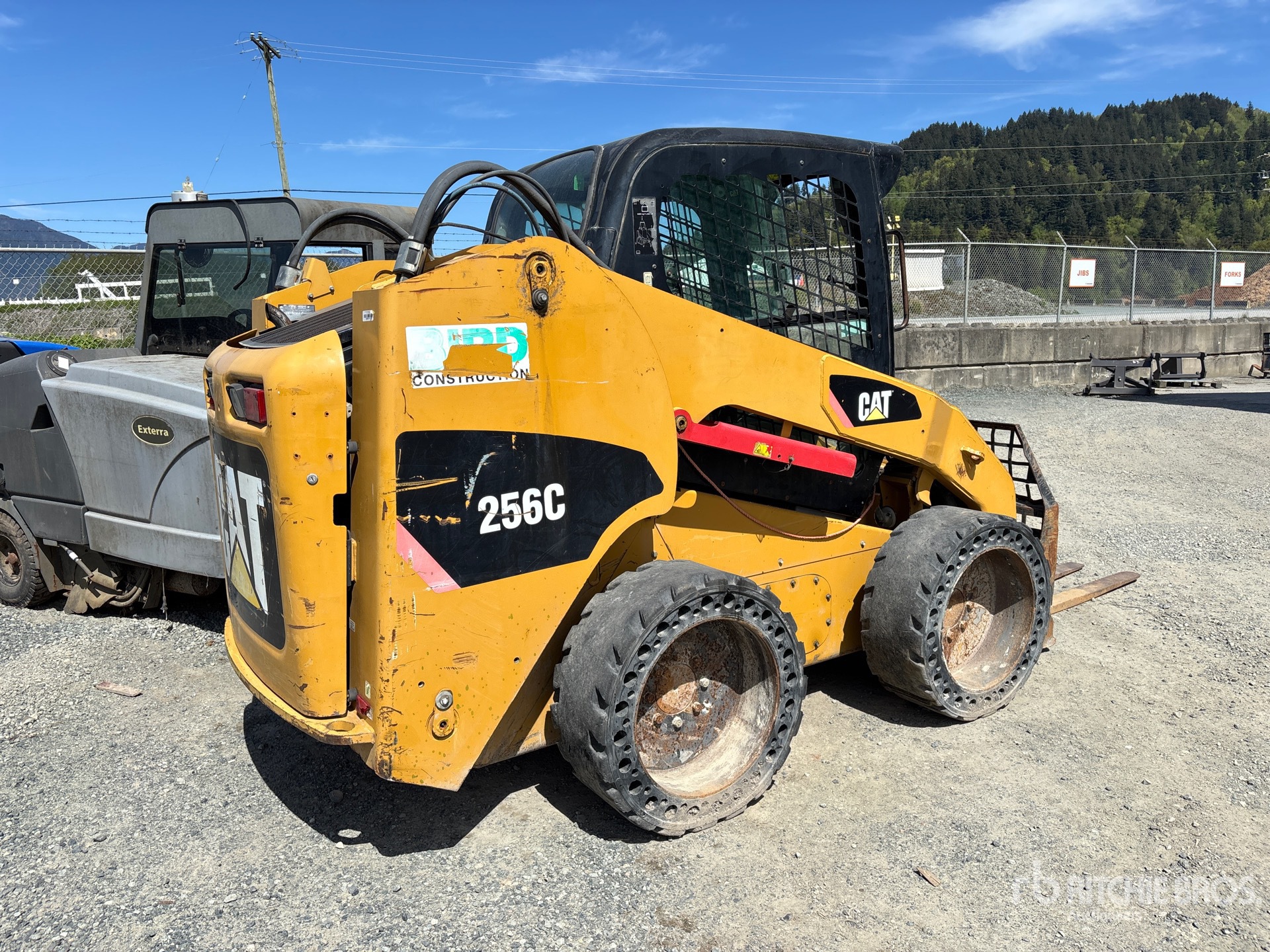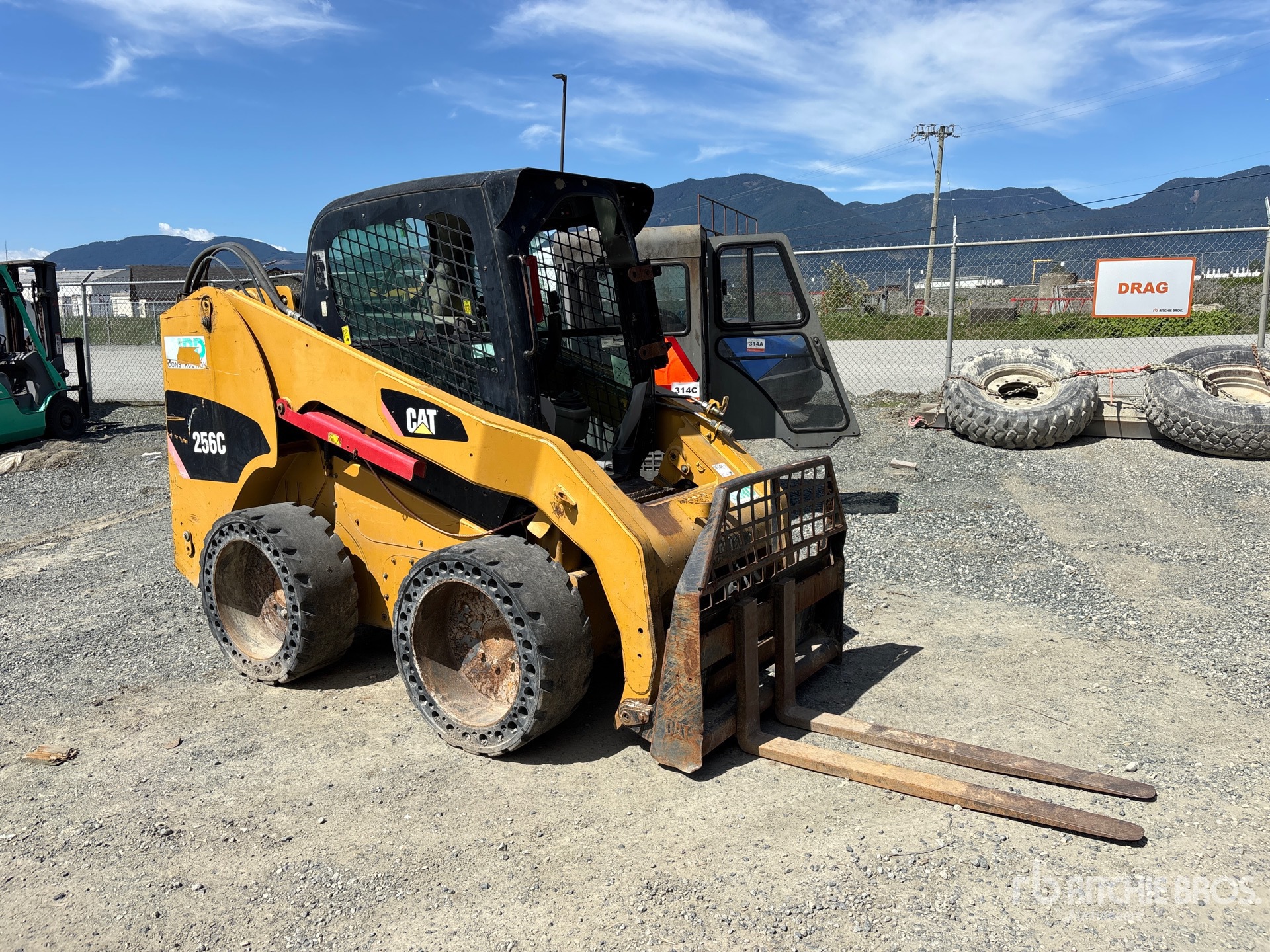 Enclosed Cab (Door missing), Air Conditioner, Ride Control, Creep Mode, Self Leveling, Aperture Tires, Hydraulic Coupler, Forks