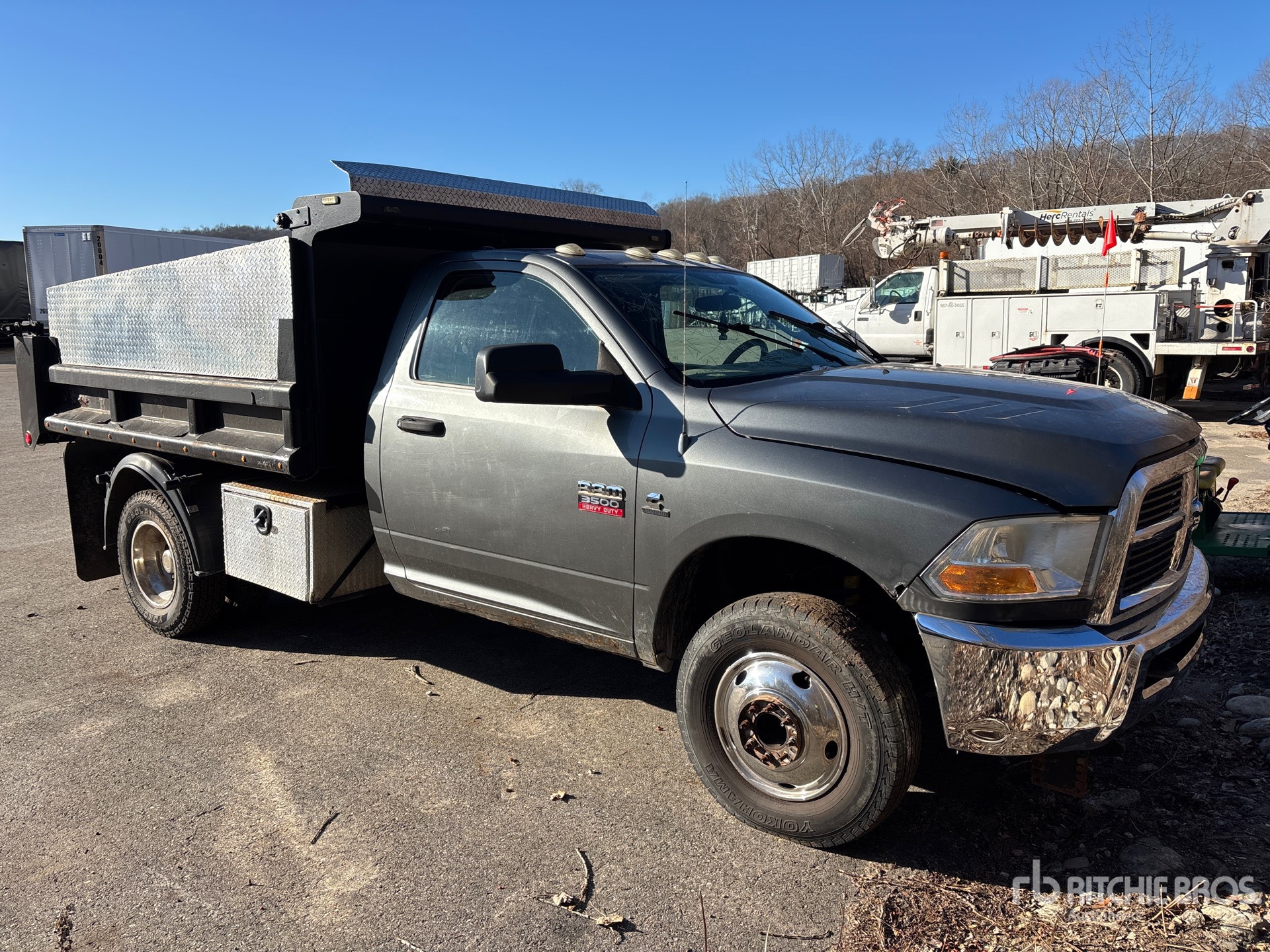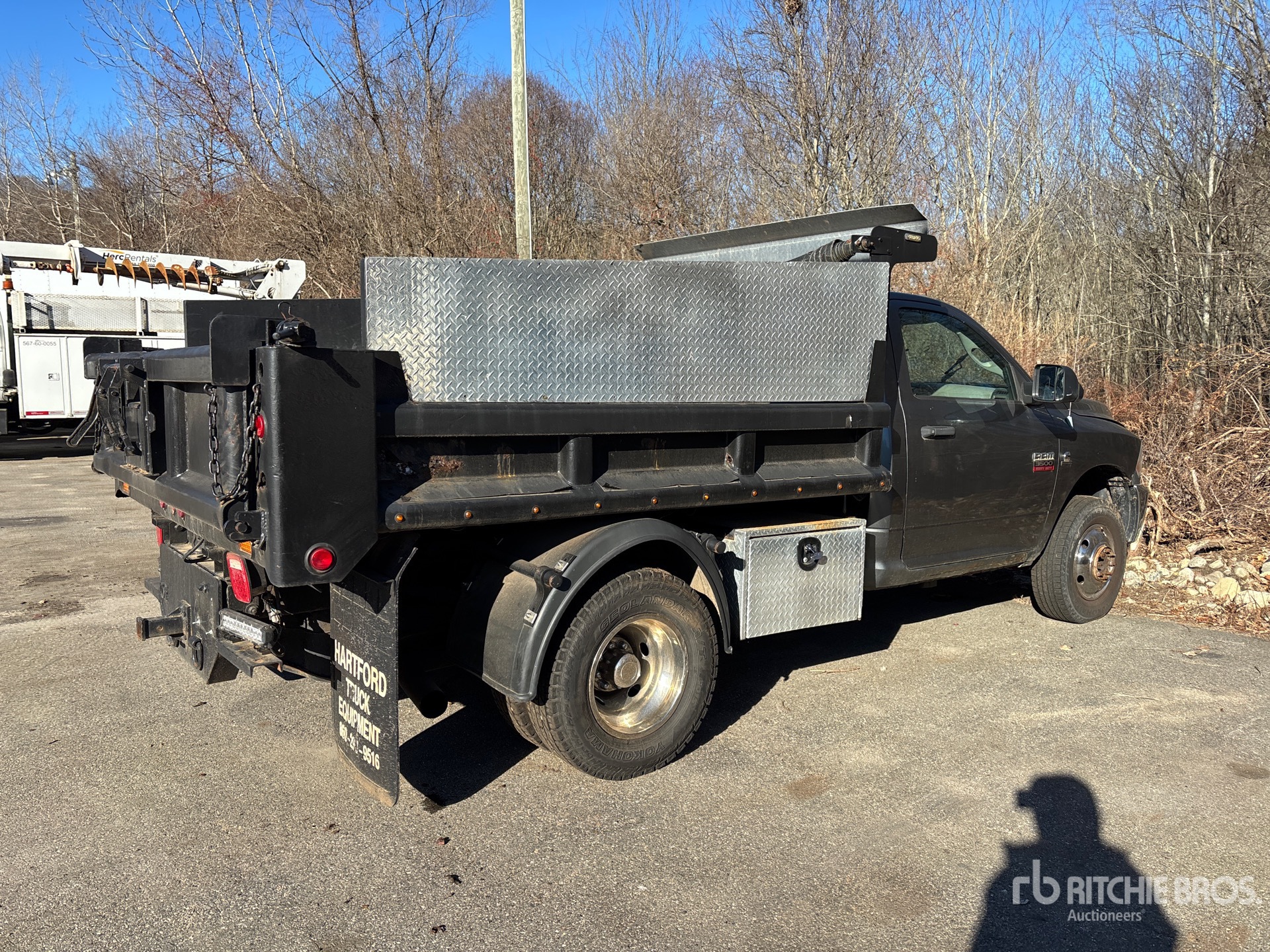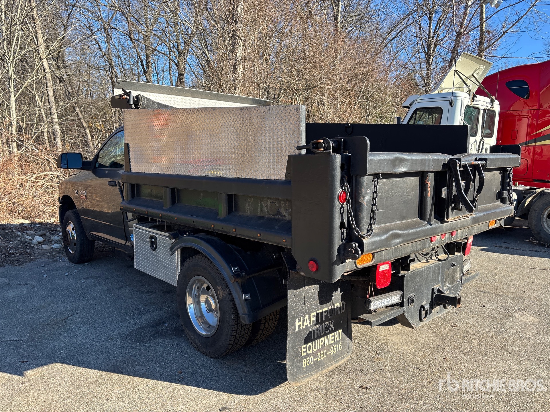 Cummins ISB305 6 Cylinder 6.7 L Diesel 305 hp Engine, 2010 US EPA Label, CARB Compliant, Requires Diesel Exhaust Fluid, 6242 Engine hrs, Automatic Transmission, 5500 lb Front Axle, 9350 lb Rears, 13000 lb GVWR, Dual Rear Wheel, 235/80/17, Spring Suspension, 144 in Wheelbase, 9 ft Long x 12 in High Steel Body, Manual Roll Tarp, Tailgate Chute
