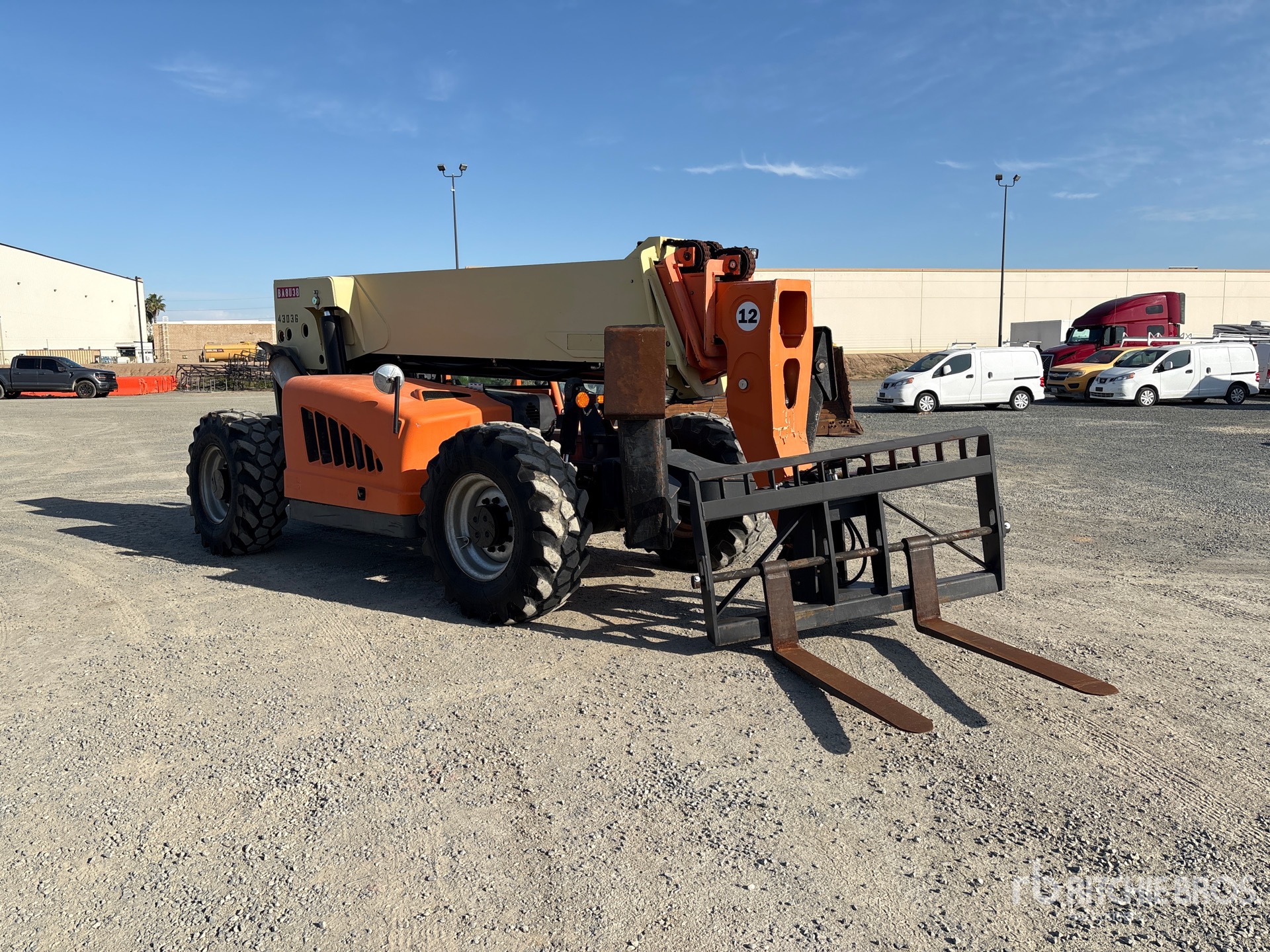 Open Operator Station, 55 ft Max Lift Height, 12000 lb Max Lift Capacity, 60 in Forks, Swing Carriage, Manual Coupler, Outriggers, Frame Leveling, Auxiliary Hydraulic Plumbing, 17.5-25 Tires