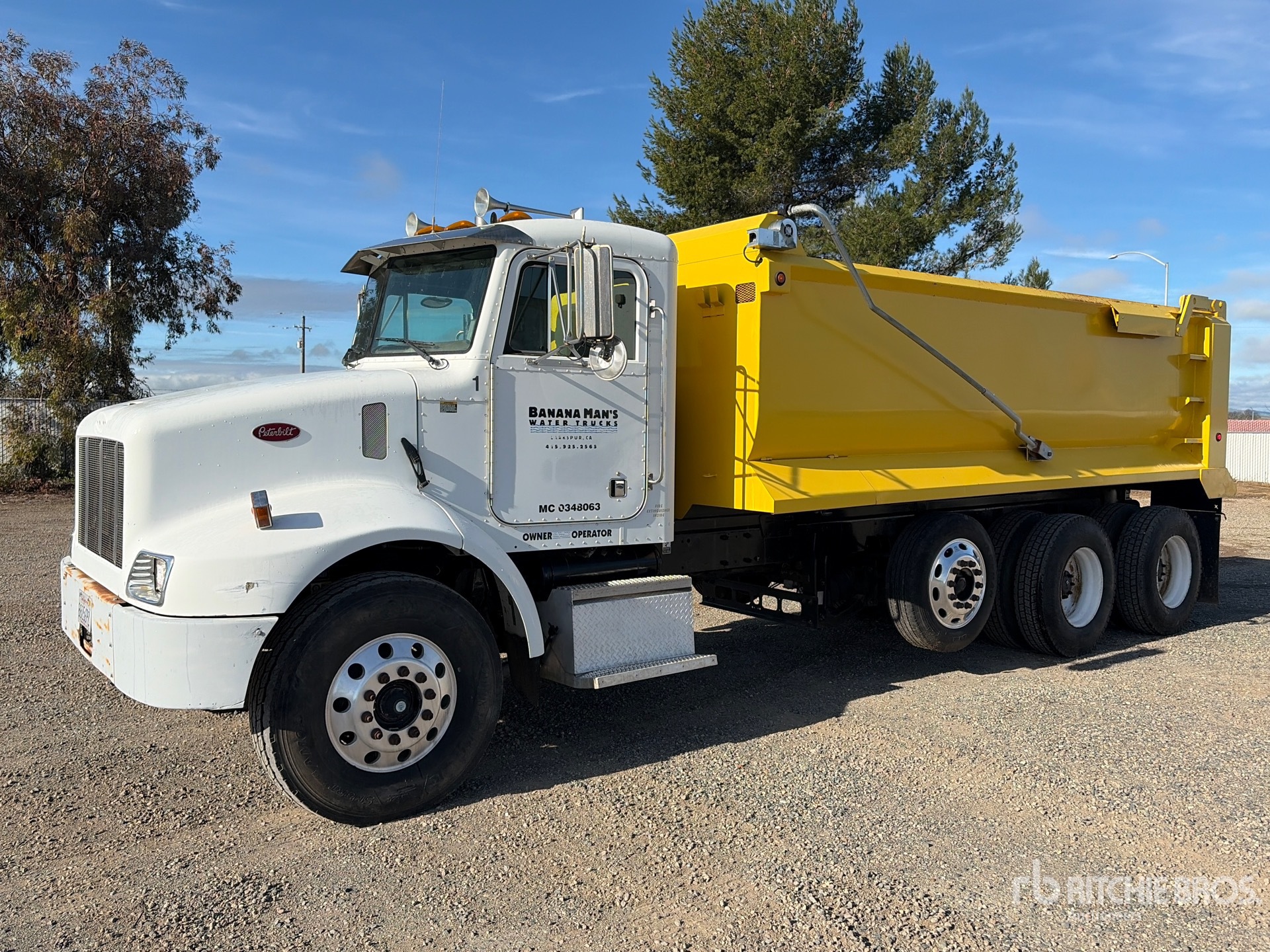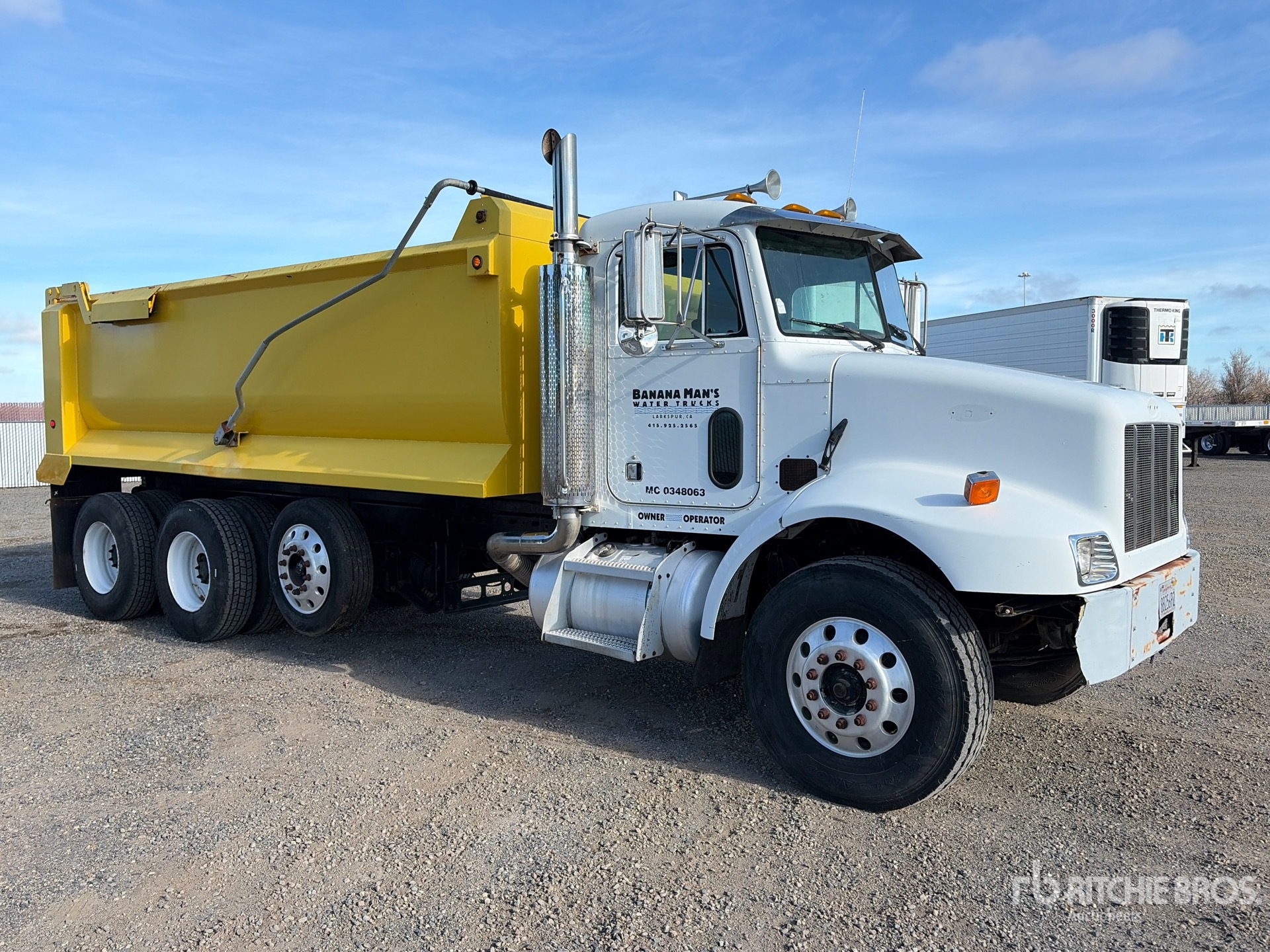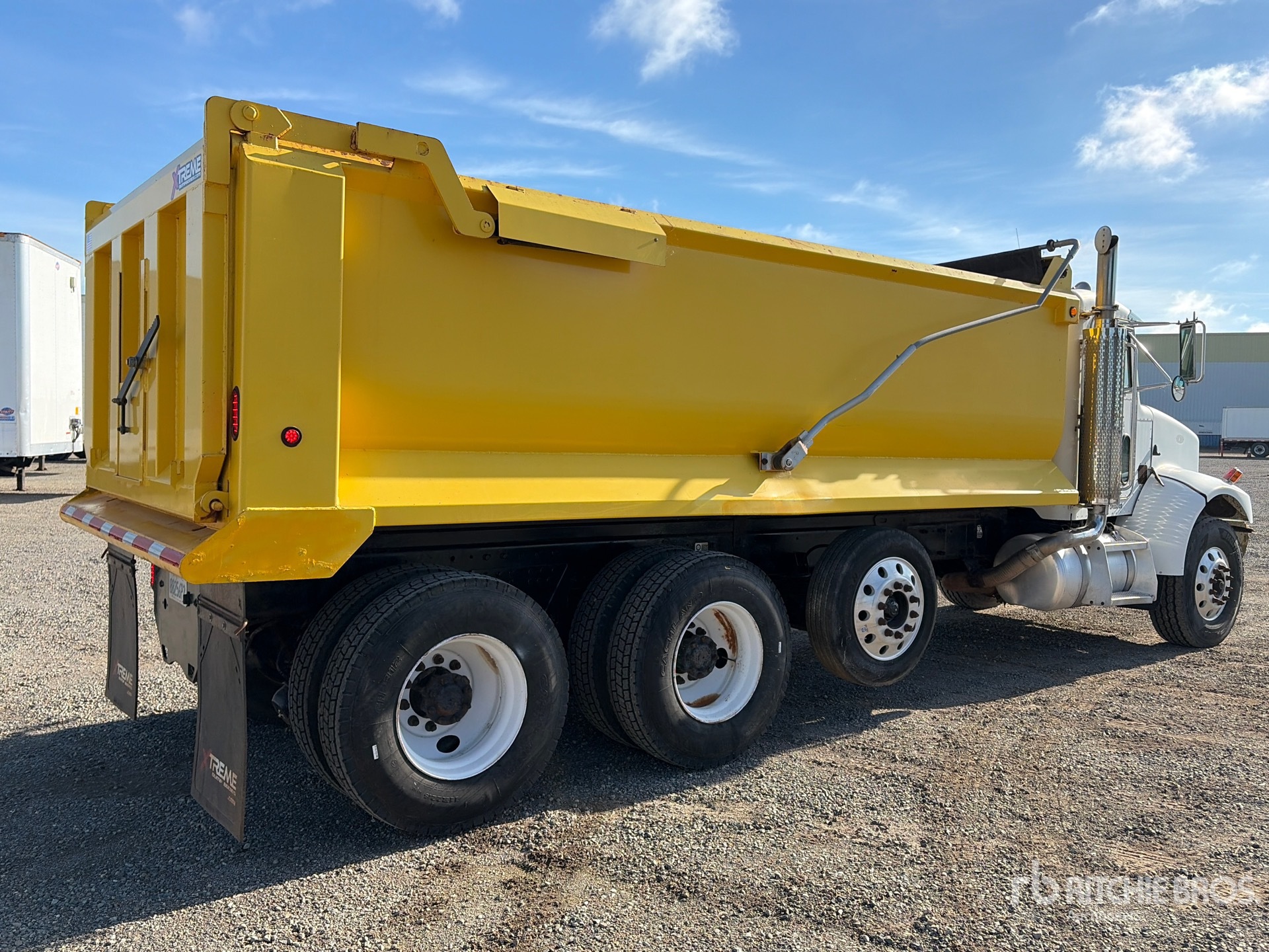 Cat 3126 6 Cylinder 7.2 L Diesel 330 hp Engine, 2003 US EPA Label, Exhaust Brake, Eaton Fuller RT8908LL Manual Transmission, Differential Lock, 14500 lb Front Axle, 40000 lb Rears, Dana DSP41 Drive Axles, 4.33:1 Axle Ratio, 54600 lb GVWR, 238 in Wheelbase, PTO, Extreme 18 ft Long x 4 ft High Steel Body, Electric Roll Tarp, Air High-Lift Tailgate, Tailgate Chute