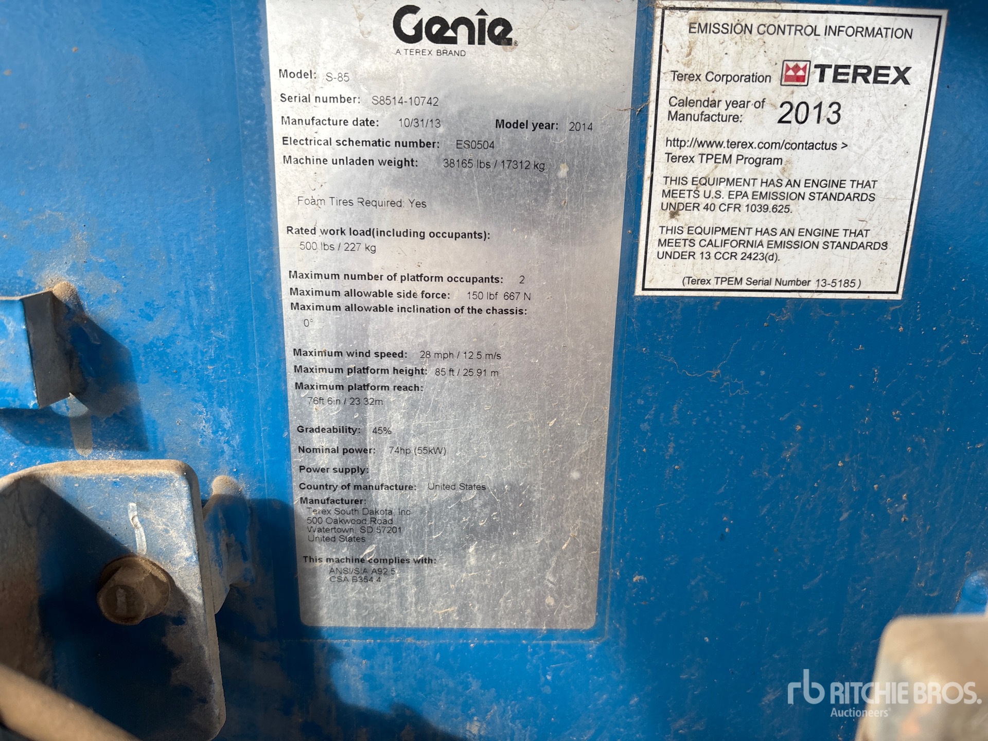 85 ft Max Platform Height, 500 lb Max Weight Capacity, Jib, Power to Platform, Deutz TD2011L04I 4 Cylinder Diesel Engine, 18-625 Tires
