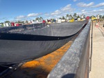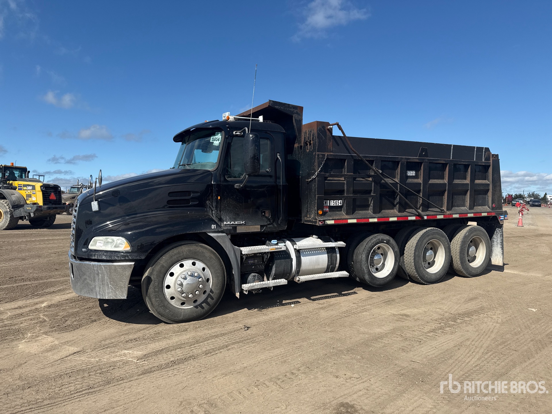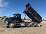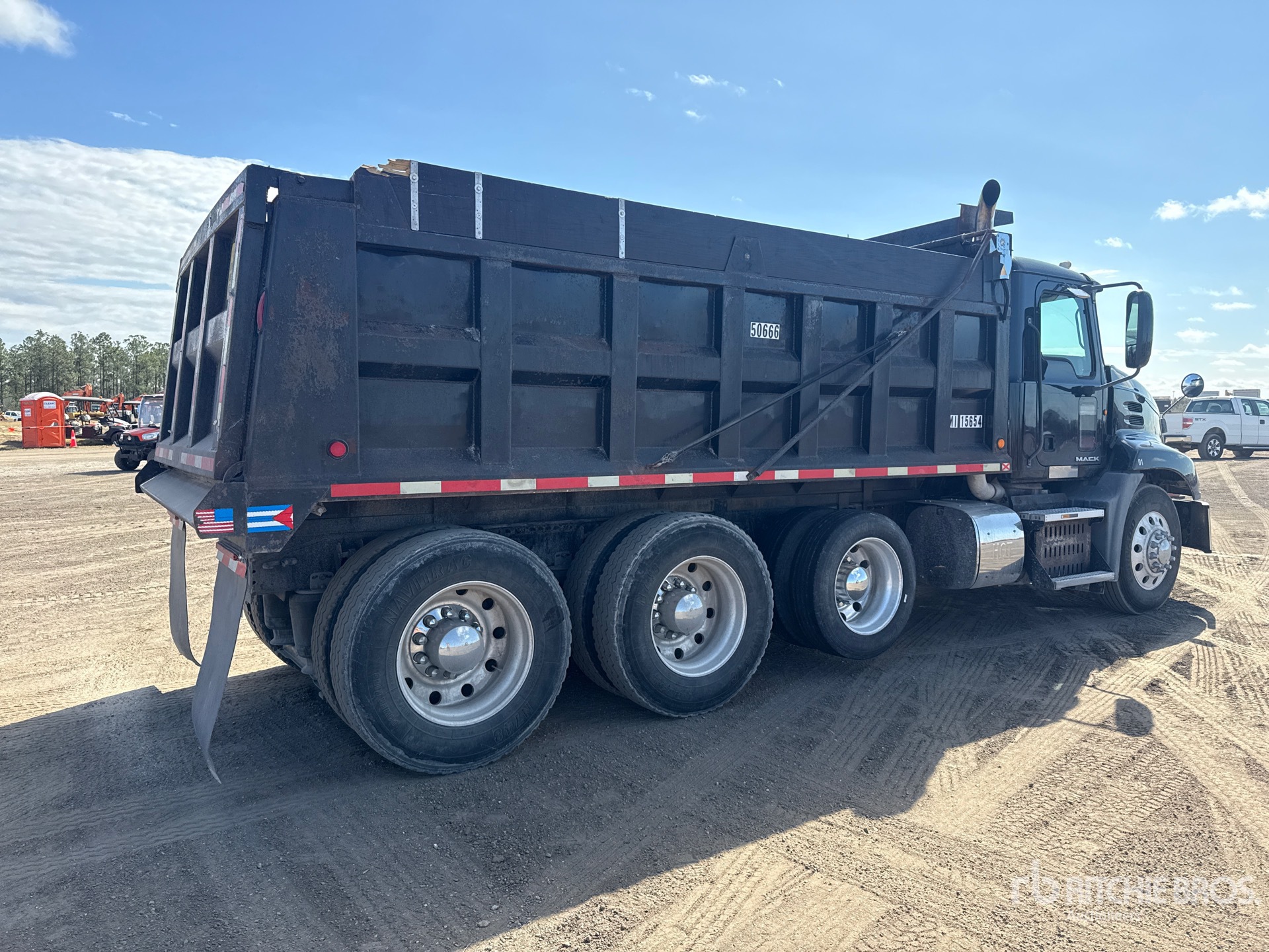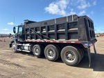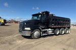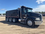 Mack MP8 6 Cylinder Diesel Engine, Requires Diesel Exhaust Fluid, Engine Brake, Eaton Fuller 10-Speed Manual Transmission, 12000 lb Front Axle, 40000 lb Rears, 52000 lb GVWR, Air Ride Cab, Aluminum Outer Wheels, 11R24.5, Air Lift Pusher Axle, Air Ride Suspension, 210 in Wheelbase, PTO, 16 ft Long x 4 ft High Steel Body, Electric Roll Tarp