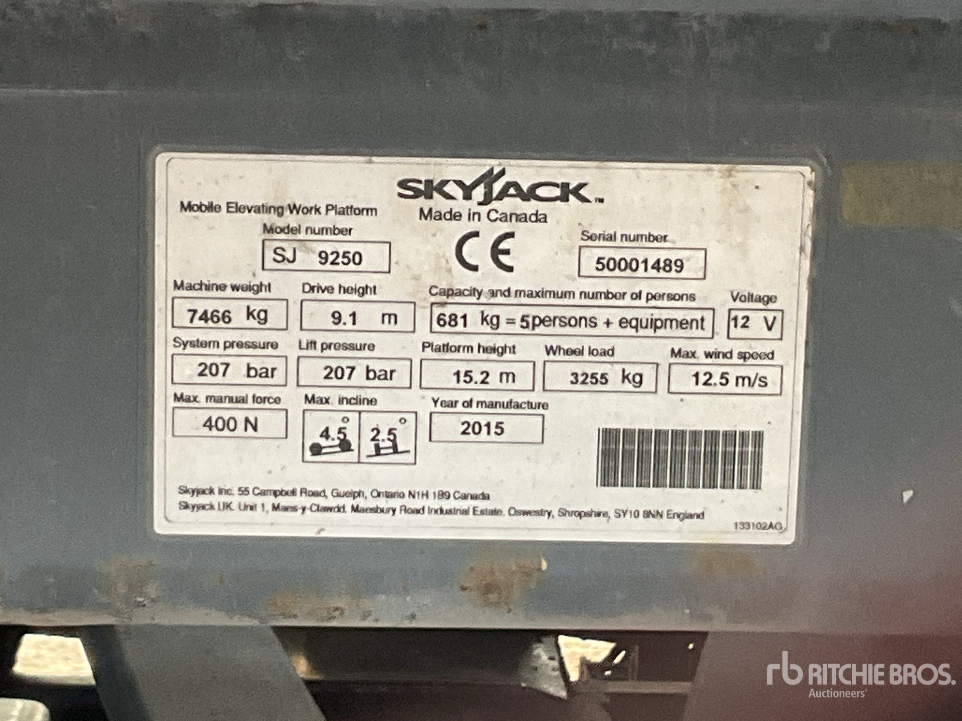 详细的设备信息范围有限,且除本文明确列出的方面或组件外,利氏兄弟拍卖公司并未检查设备中的任何其他方面或组件。除非另有明确声明,我们不会对设备或其组件作出任何形式的明示或暗示的陈述或保证。这包括但不限于关于功能、符合或遵循任何适用权力机构或监管机构的安全标准或要求、适用于任何特定用途,或者适销性的任何陈述或保证。我们强烈建议您在竞拍之前自行对设备进行详细检查。