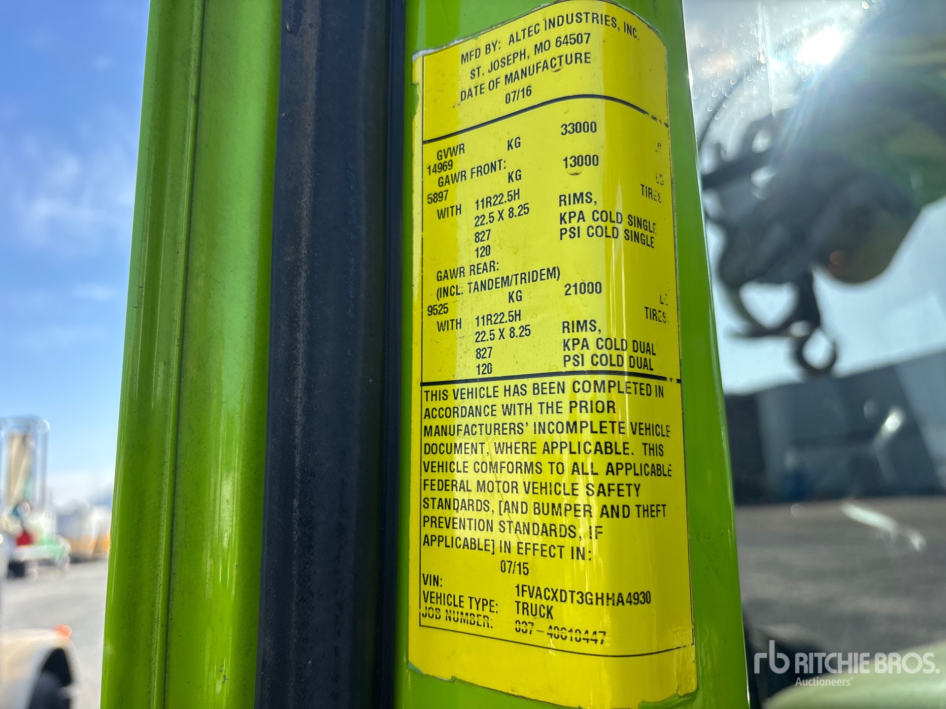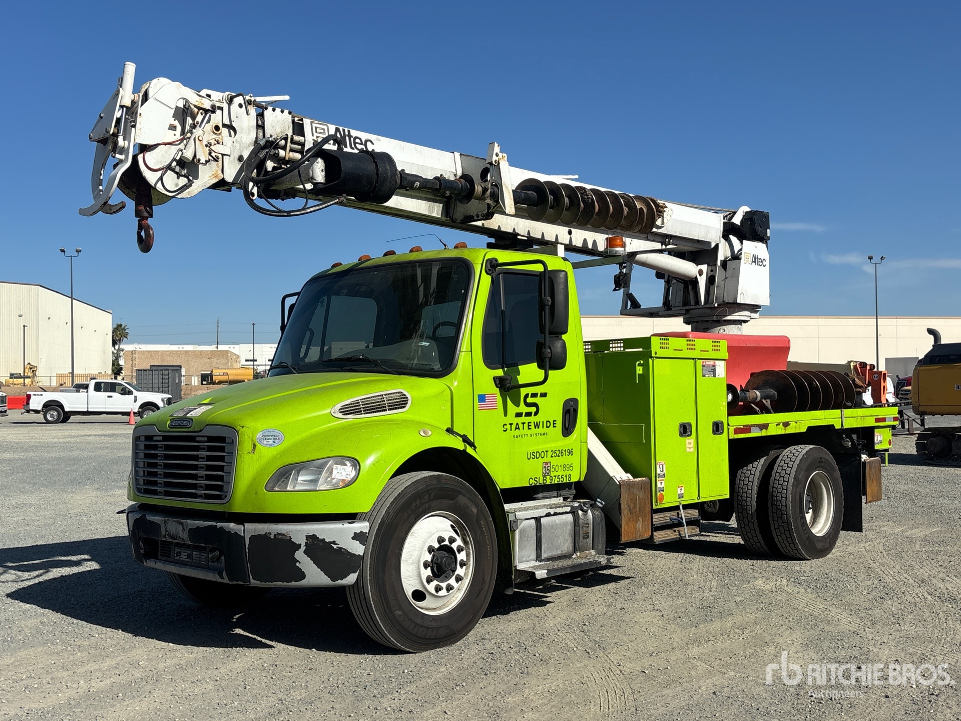Located in Lane 10 Spot 20, Cummins ISB 6 Cylinder 6.7 L Diesel 260 hp Engine, 2016 US EPA Label, Requires Diesel Exhaust Fluid, 7368 Engine hrs, Allison 3500 Automatic Transmission, Differential Lock, 13000 lb Front Axle, 21000 lb Rears, Meritor MS-21-14X Drive Axles, 5.57:1 Axle Ratio, 33000 lb GVWR, 11R22.5 Front Tires, 11R22.5 Rear Tires, Spring Suspension, 190 in Wheelbase, PTO, 47 ft Sheave Height, 23790 lb Capacity, Rear Mounted, 37 ft Reach, 12 in Auger, Turret Mounted Winch, One-Man Basket, Altec 14 ft 8 in Body, X-Type Outriggers, Rear Outriggers, Cordless Remote Control, Hydraulic Hose Reel