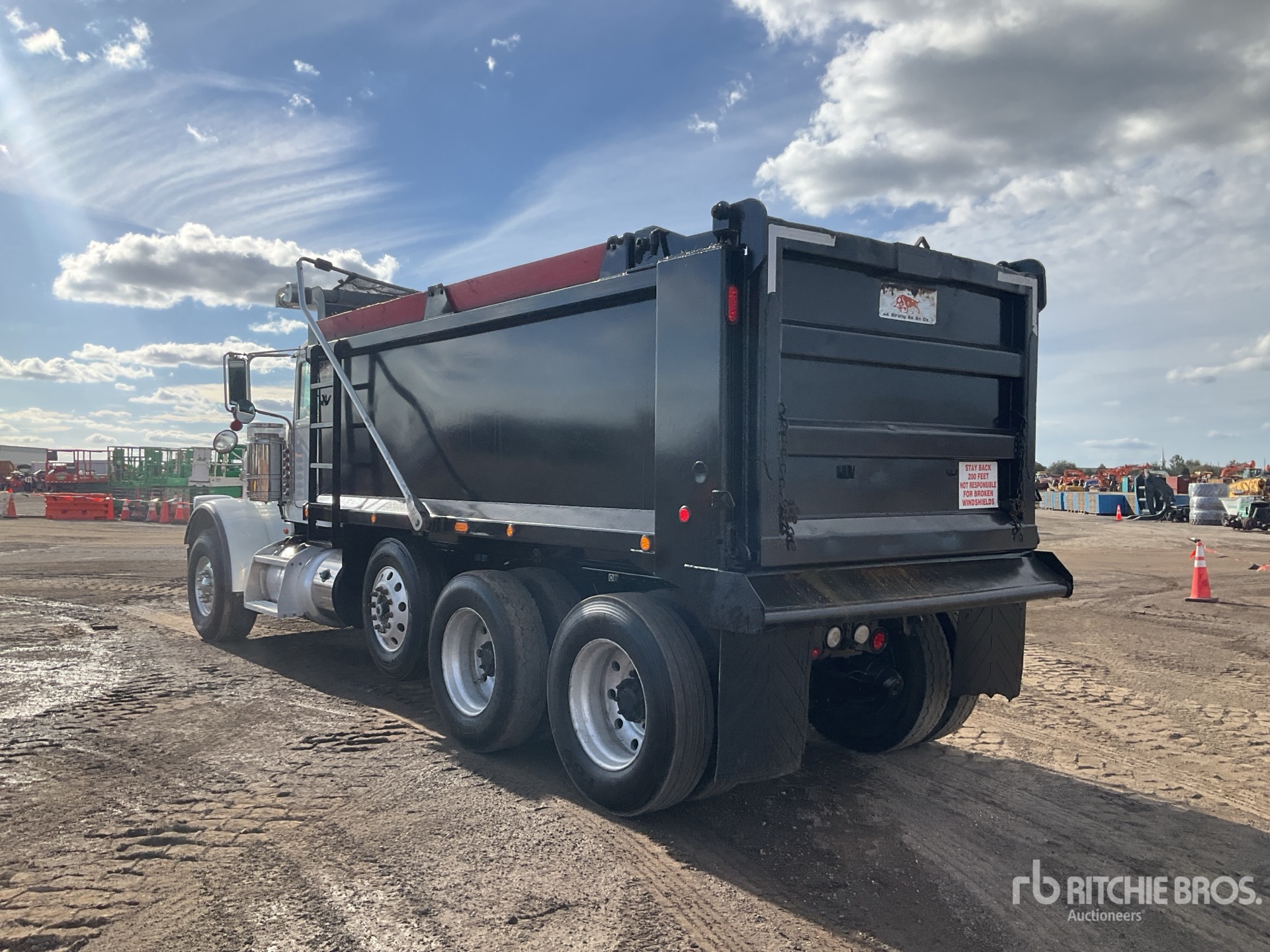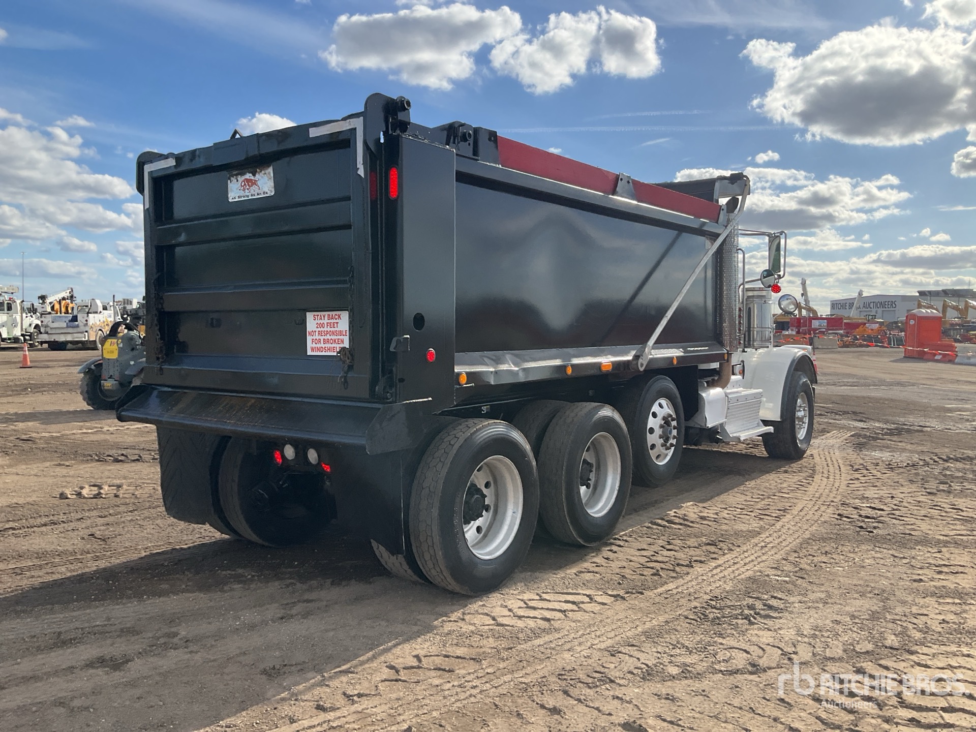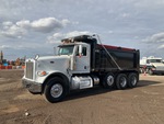 Cummins ISX12 6 Cylinder 11.9 L Diesel 425 hp Engine, 2015 US EPA Label, Requires Diesel Exhaust Fluid, 23933 Engine hrs, Engine Brake, Automatic Transmission, Differential Lock, 20000 lb Front Axle, 59220 lb Rears, 79220 lb GVWR, Aluminum Wheels, 425/65R22.5 Front Tires, 11R24.5 Rear Tires, Steerable Air Lift Pusher Axle, Dual Steering Boxes, Double Frame, Chalmers Rubber Suspension, 224 in Wheelbase, PTO, OX Bodies 15 ft 11 in Long x 4 ft 2 in High Steel Body, Electric Roll Tarp