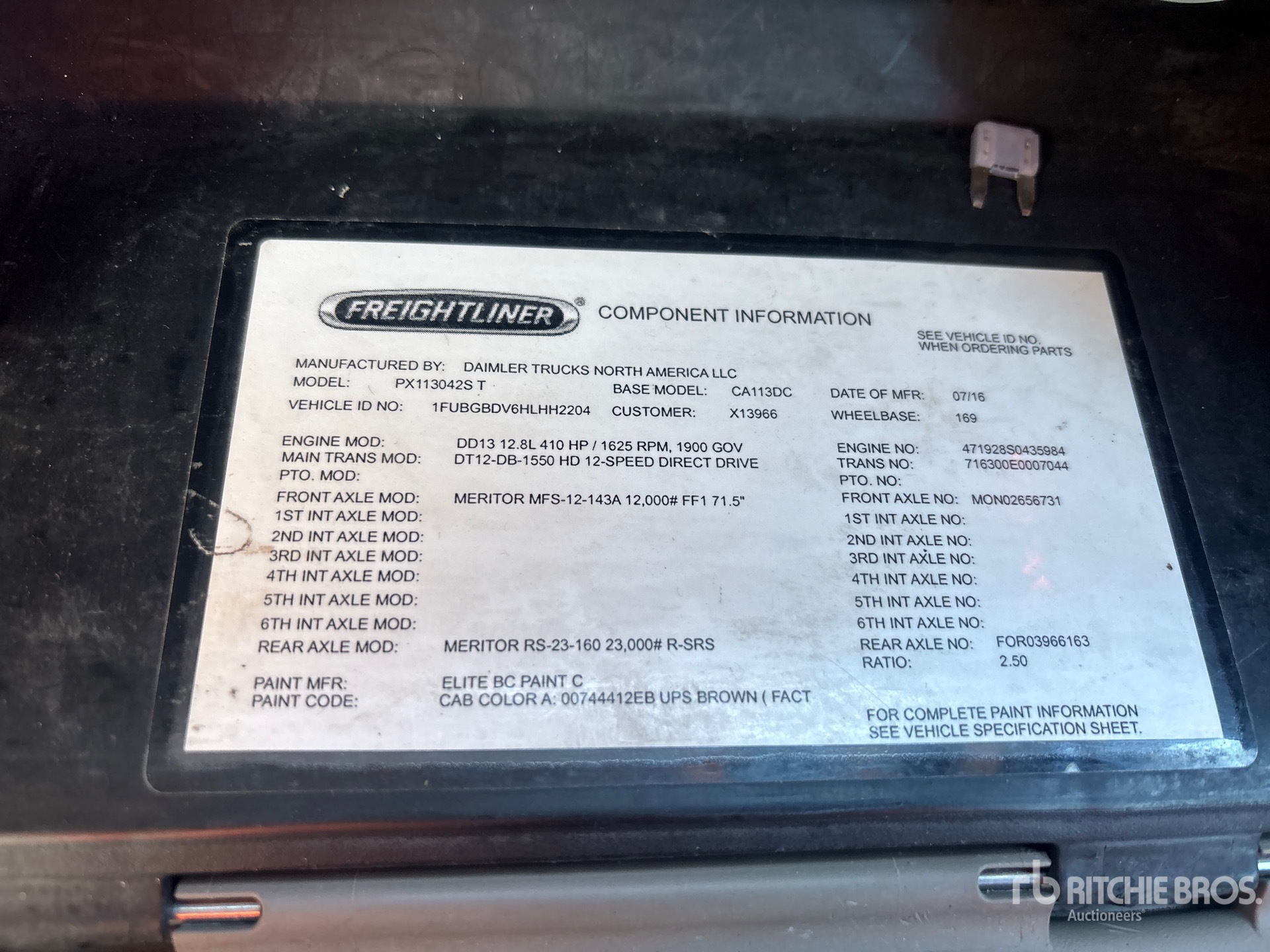 Detroit DD13 410 hp Engine, 2016 US EPA Label, 23228 Engine hrs, Detroit DT12-DB-1550 12-Speed Automated Transmission, 12000 lb Front Axle, 22700 lb Rears, 34700 lb GVWR, 169 in Wheelbase, Air Suspension, 295/75R22.5, Dual Fuel Tanks