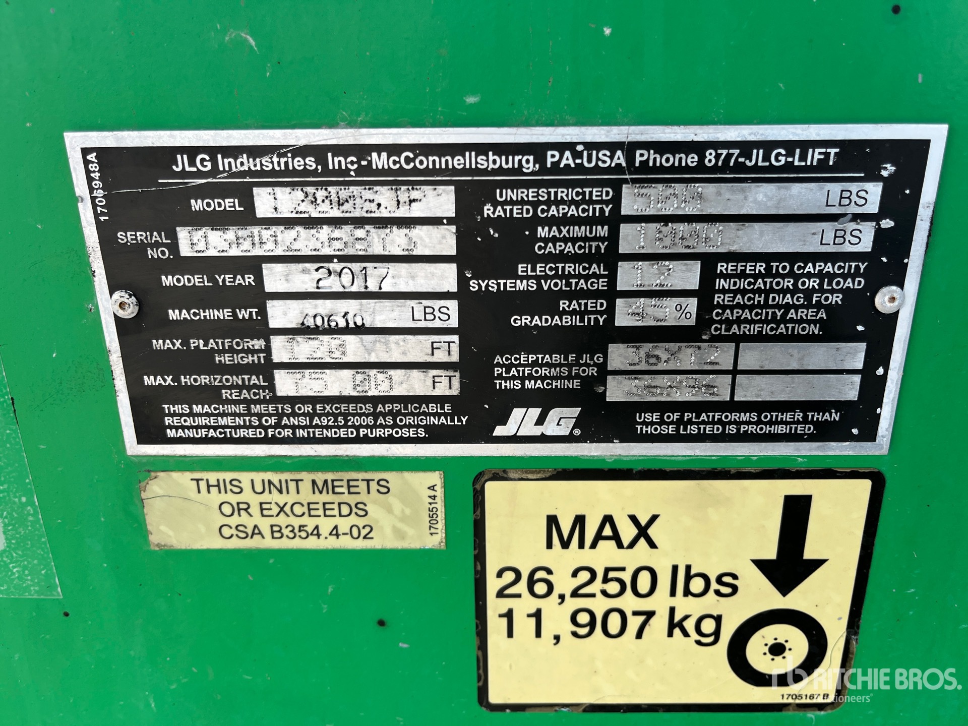 详细的设备信息范围有限,且除本文明确列出的方面或组件外,利氏兄弟拍卖公司并未检查设备中的任何其他方面或组件。除非另有明确声明,我们不会对设备或其组件作出任何形式的明示或暗示的陈述或保证。这包括但不限于关于功能、符合或遵循任何适用权力机构或监管机构的安全标准或要求、适用于任何特定用途,或者适销性的任何陈述或保证。我们强烈建议您在竞拍之前自行对设备进行详细检查。