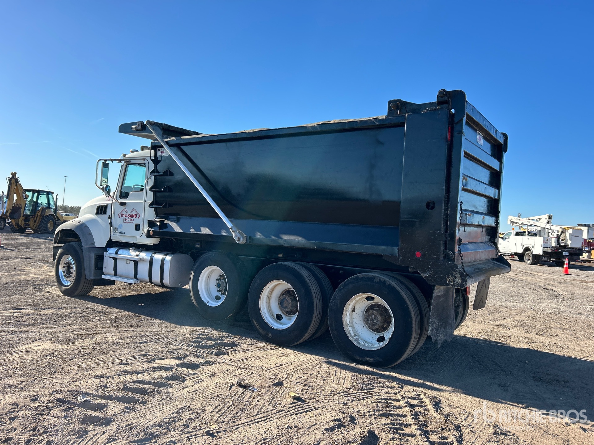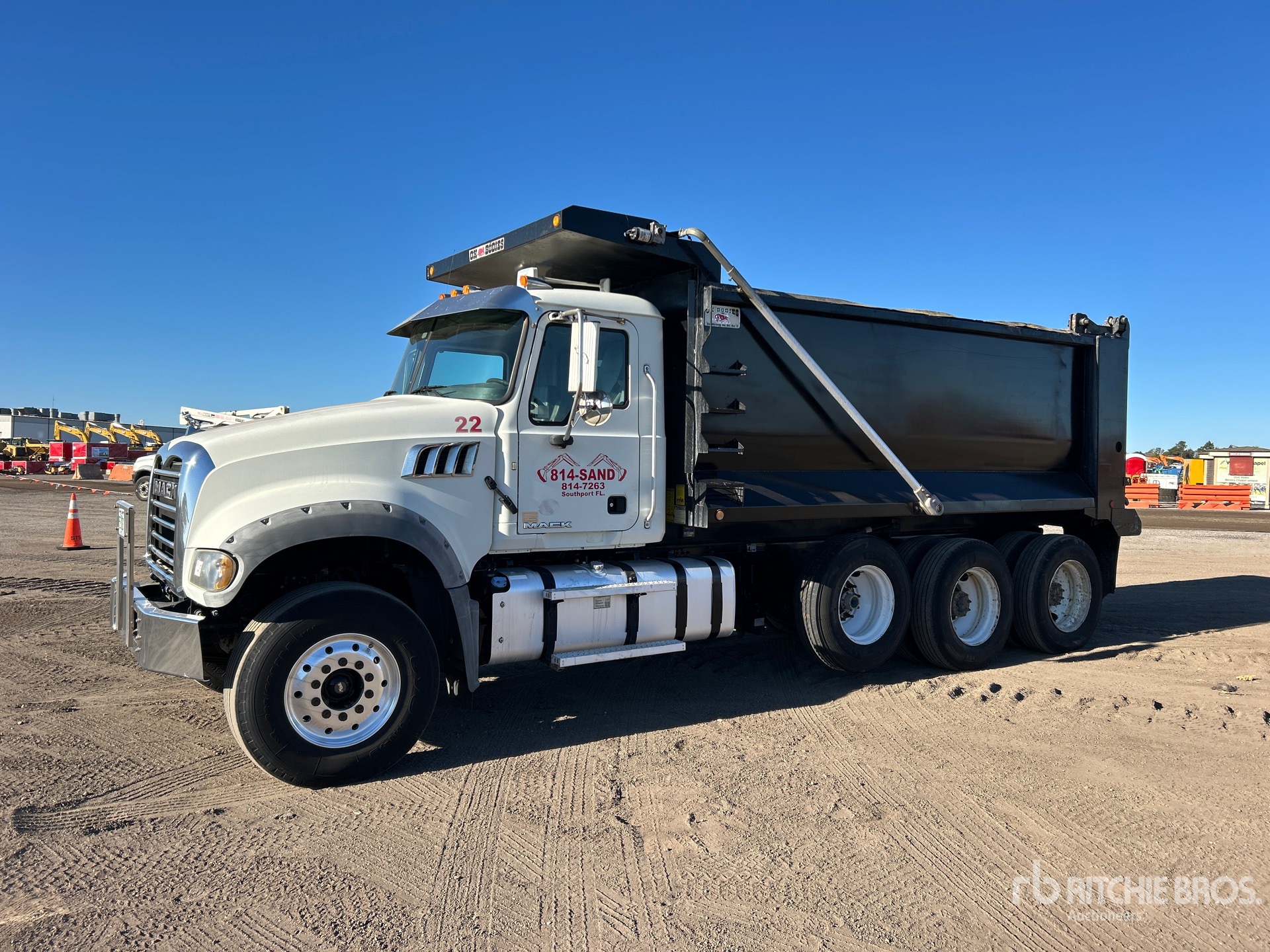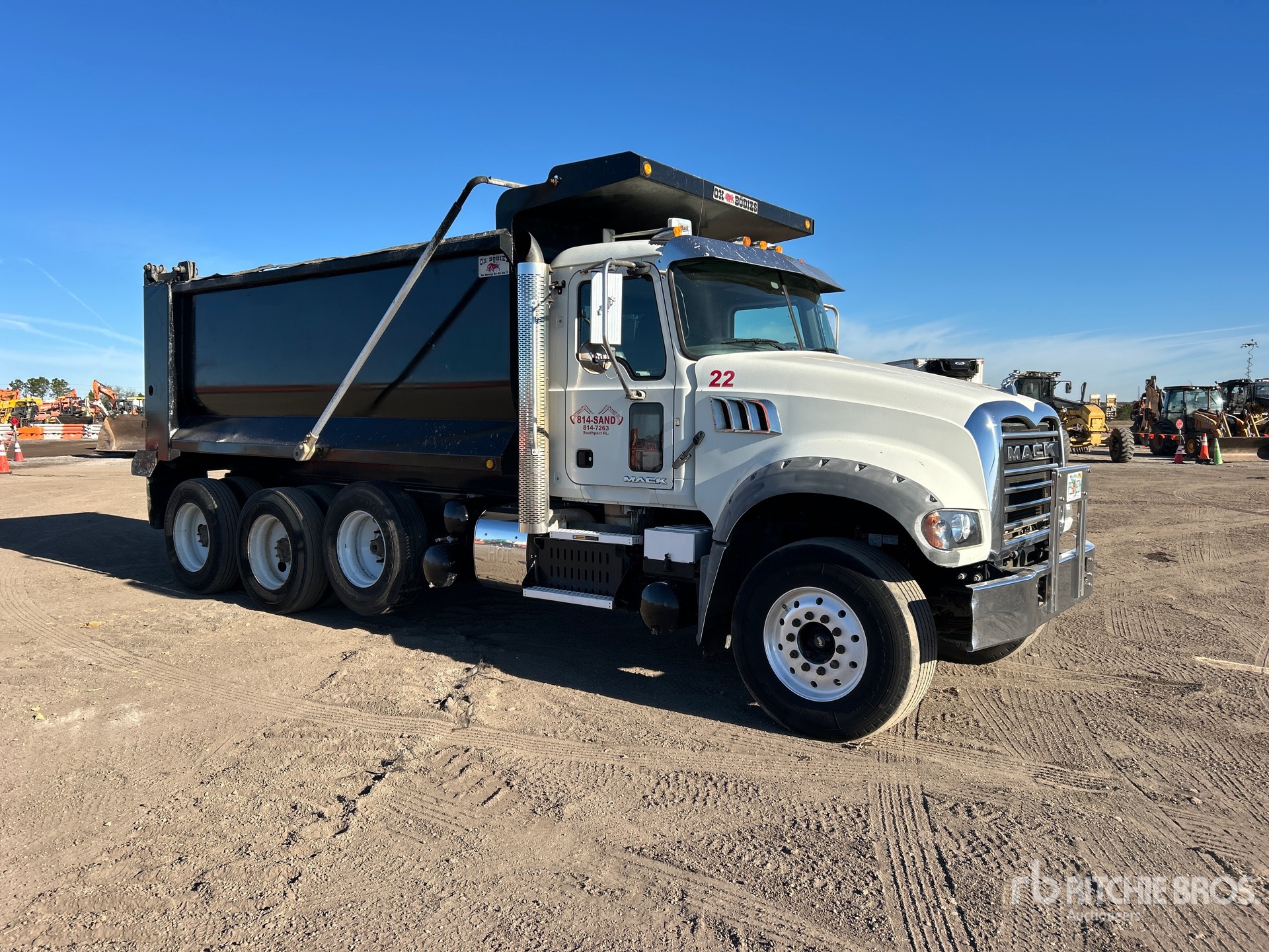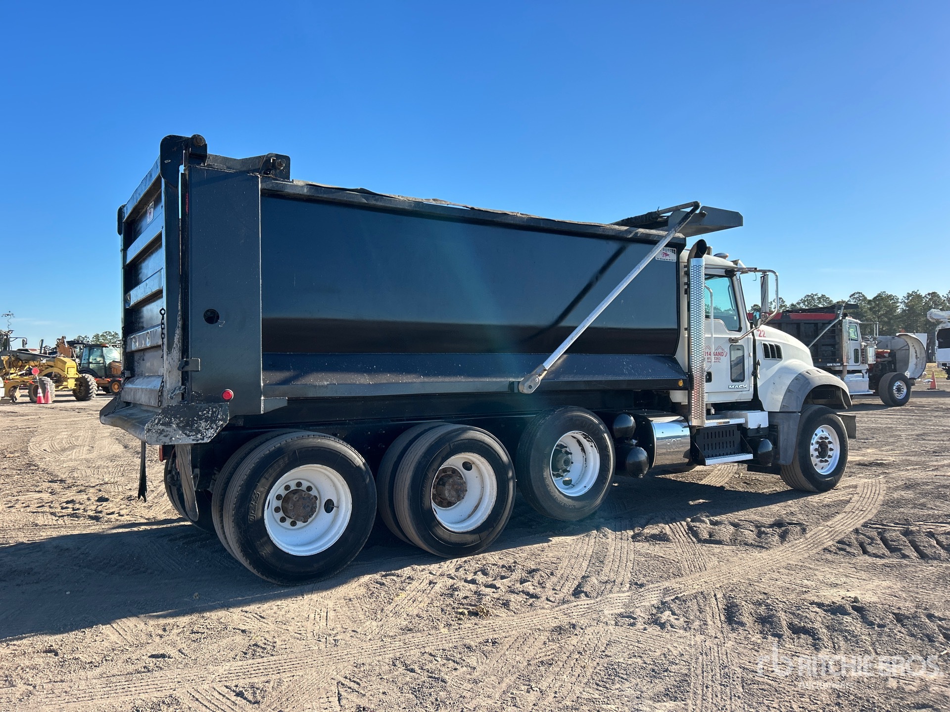 Mack MP8 6 Cylinder 12.8 L Diesel 455 hp Engine, 2016 US EPA Label, Requires Diesel Exhaust Fluid, 4030 Engine hrs, Engine Brake, Allison Automatic Transmission, 18000 lb Front Axle, 44000 lb Rears, 62000 lb GVWR, Aluminum Front Wheels, 385/65R22.5 Front Tires, 12R24.5 Rear Tires, Camelback Suspension, 227 in Wheelbase, OX Bodies 16 ft Long x 5 ft High Steel Body, 21 cyd, Capacity, Round Bottom, Bed Vibrator, Electric Roll Tarp, Air High-Lift Tailgate, Pintle Hitch