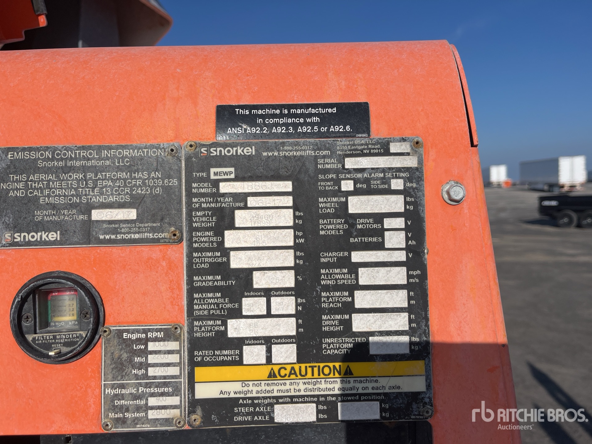 详细的设备信息范围有限,且除本文明确列出的方面或组件外,利氏兄弟拍卖公司并未检查设备中的任何其他方面或组件。除非另有明确声明,我们不会对设备或其组件作出任何形式的明示或暗示的陈述或保证。这包括但不限于关于功能、符合或遵循任何适用权力机构或监管机构的安全标准或要求、适用于任何特定用途,或者适销性的任何陈述或保证。我们强烈建议您在竞拍之前自行对设备进行详细检查。