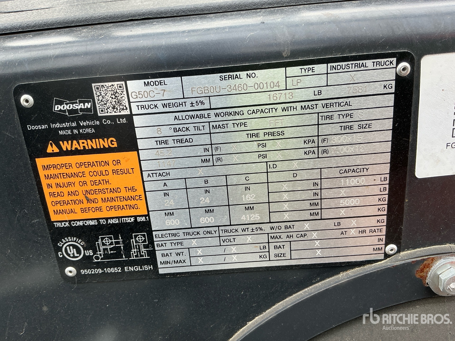 详细的设备信息范围有限,且除本文明确列出的方面或组件外,利氏兄弟拍卖公司并未检查设备中的任何其他方面或组件。除非另有明确声明,我们不会对设备或其组件作出任何形式的明示或暗示的陈述或保证。这包括但不限于关于功能、符合或遵循任何适用权力机构或监管机构的安全标准或要求、适用于任何特定用途,或者适销性的任何陈述或保证。我们强烈建议您在竞拍之前自行对设备进行详细检查。