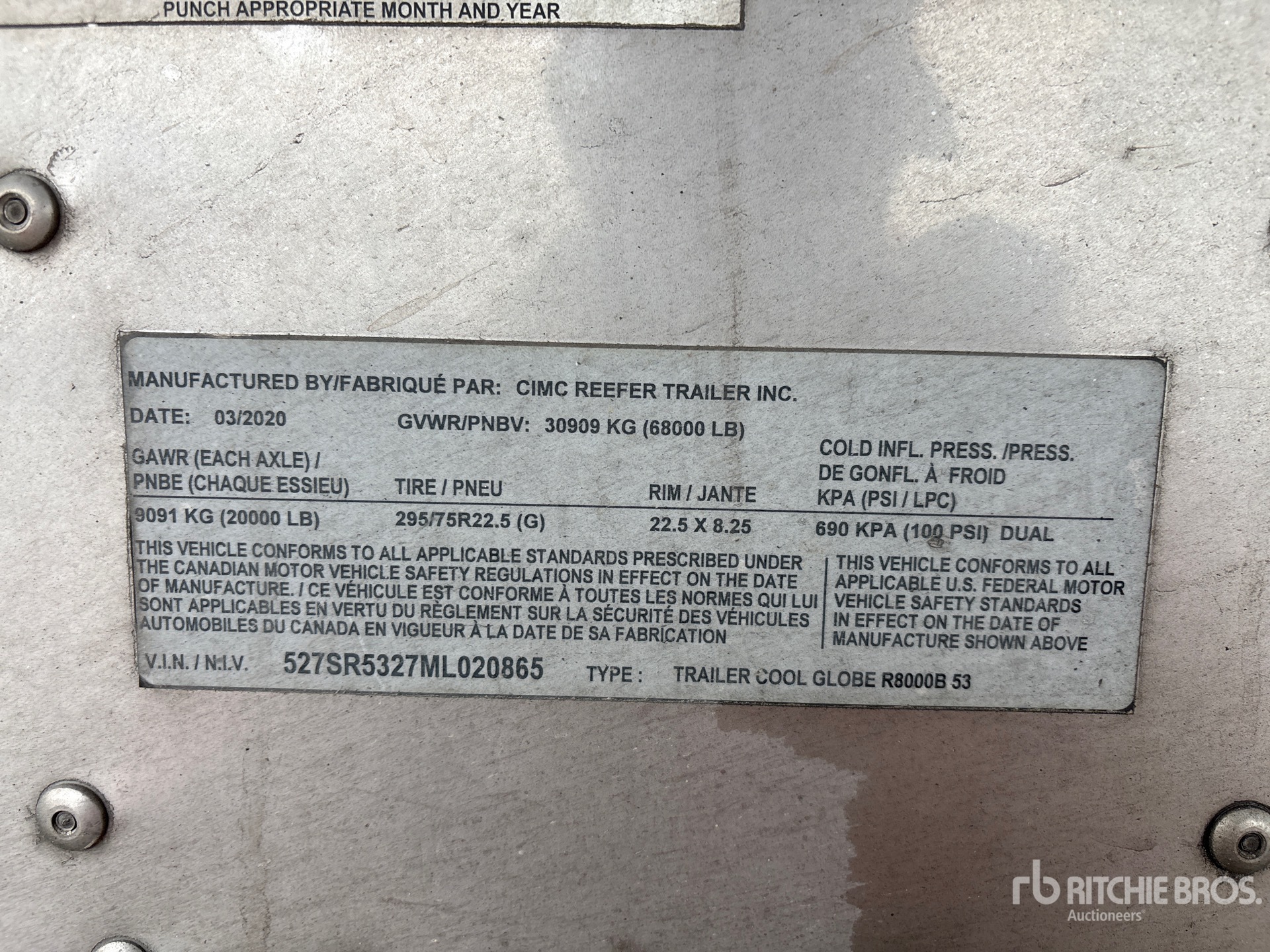 2020 Thermo King Precedent S-600 Refrigeration Unit, Aluminum/Steel Combination Frame, Air Ride Sliding Suspension, Side Skirts, Swing Door, 295/75R22.5 Tires 68000 lb GVWR