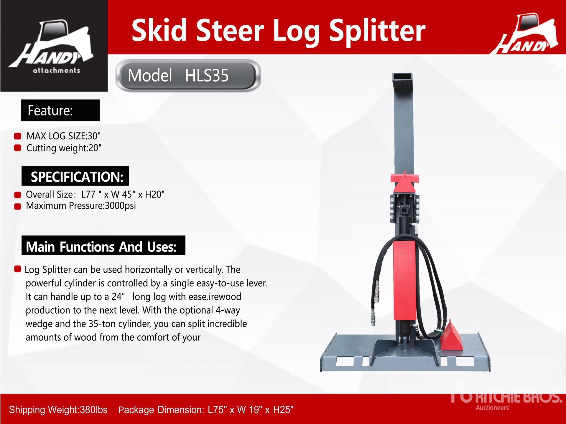 2026 Handy HLS35 30 in Skid Steer Log Splitter (Unused)