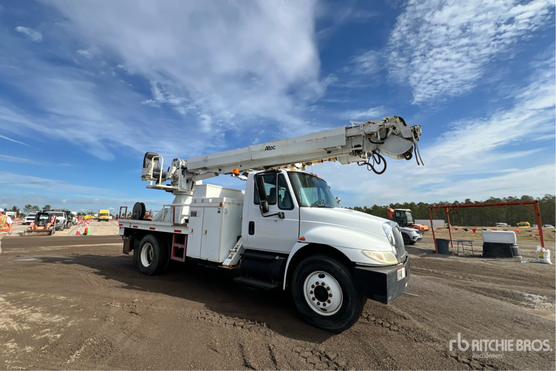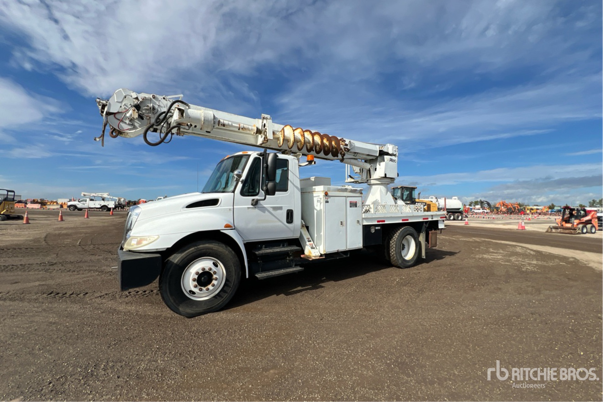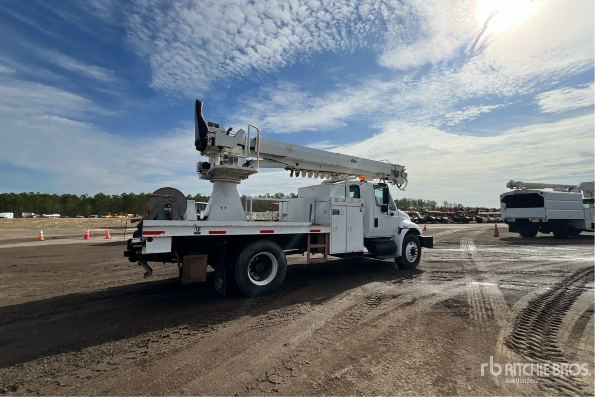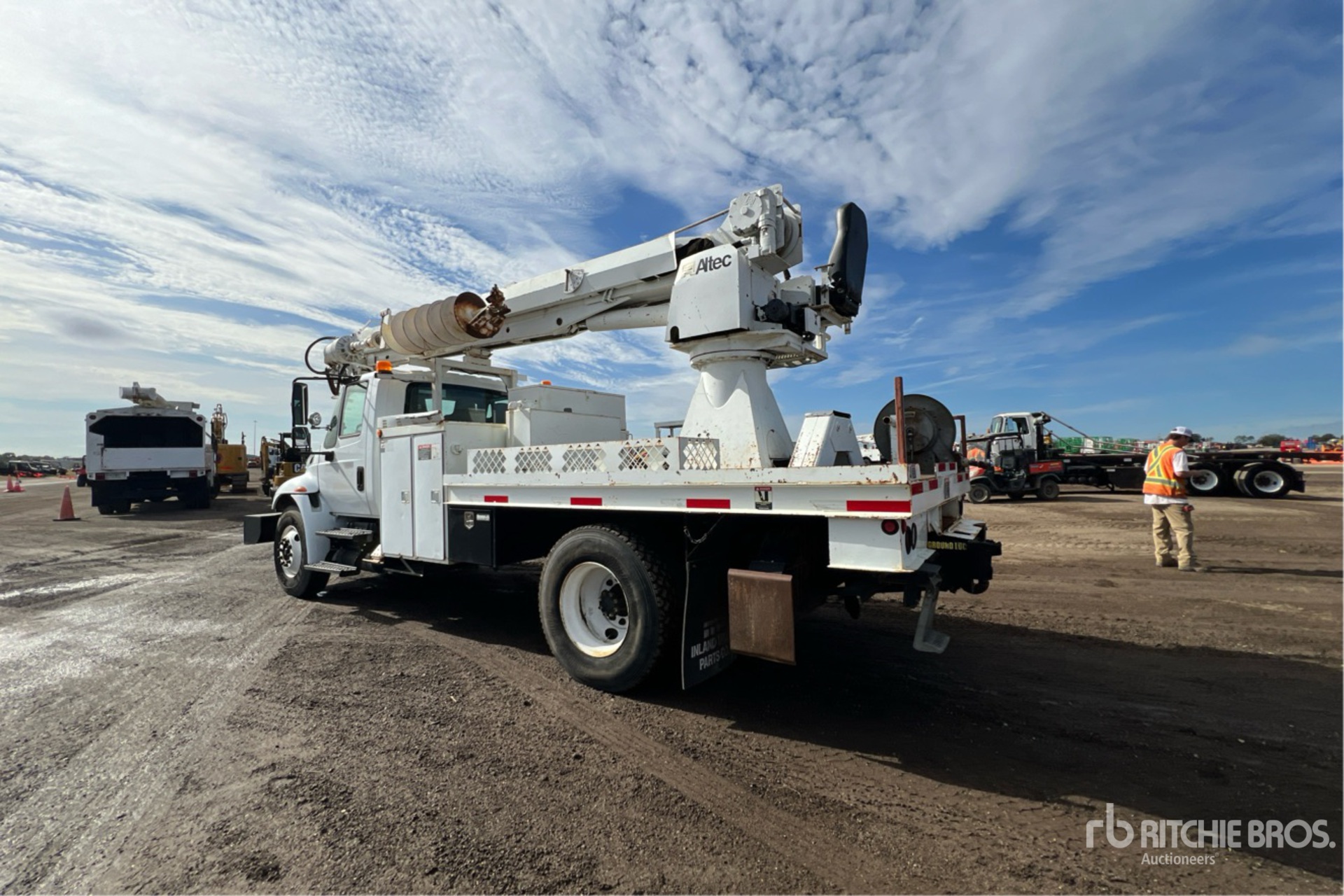 International Diesel Engine, 9011 Engine hrs, International 6-Speed Manual Transmission, 12R22.5 Front Tires, 11R22.5 Rear Tires, Spring Suspension, 188 in Wheelbase, PTO, 23790 lb Capacity, Rear Mounted, 47 ft Reach, 18 in Auger, Pole Guide, Turret Mounted Winch, 15 ft Body, A-Outriggers, Rear Outriggers, Air Hose Reel, Altec Turret - DM47 / s/n 0803DV0169