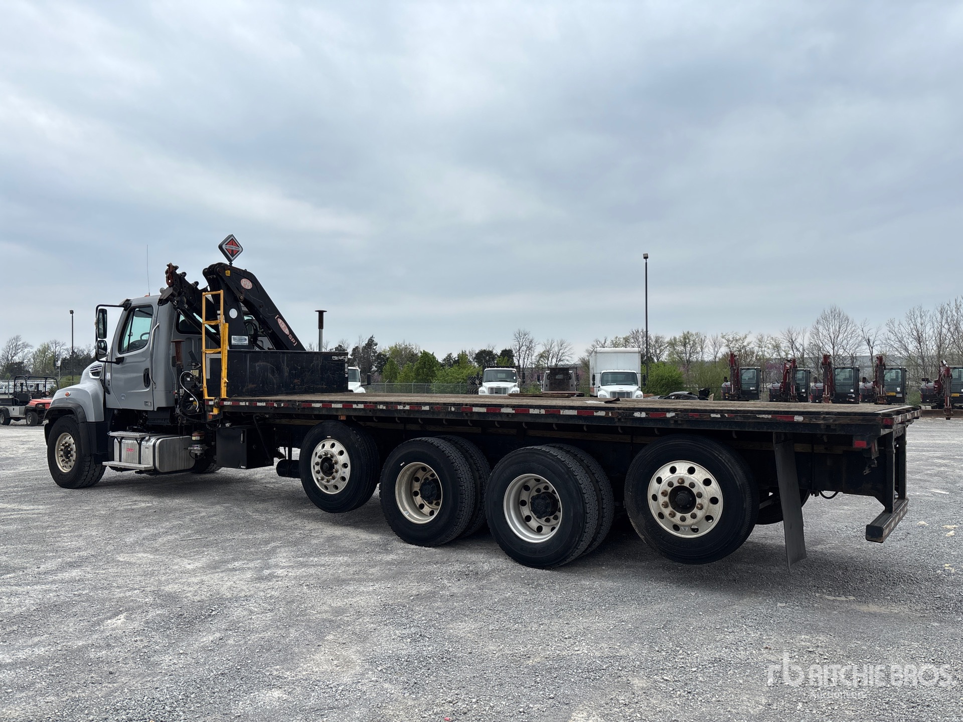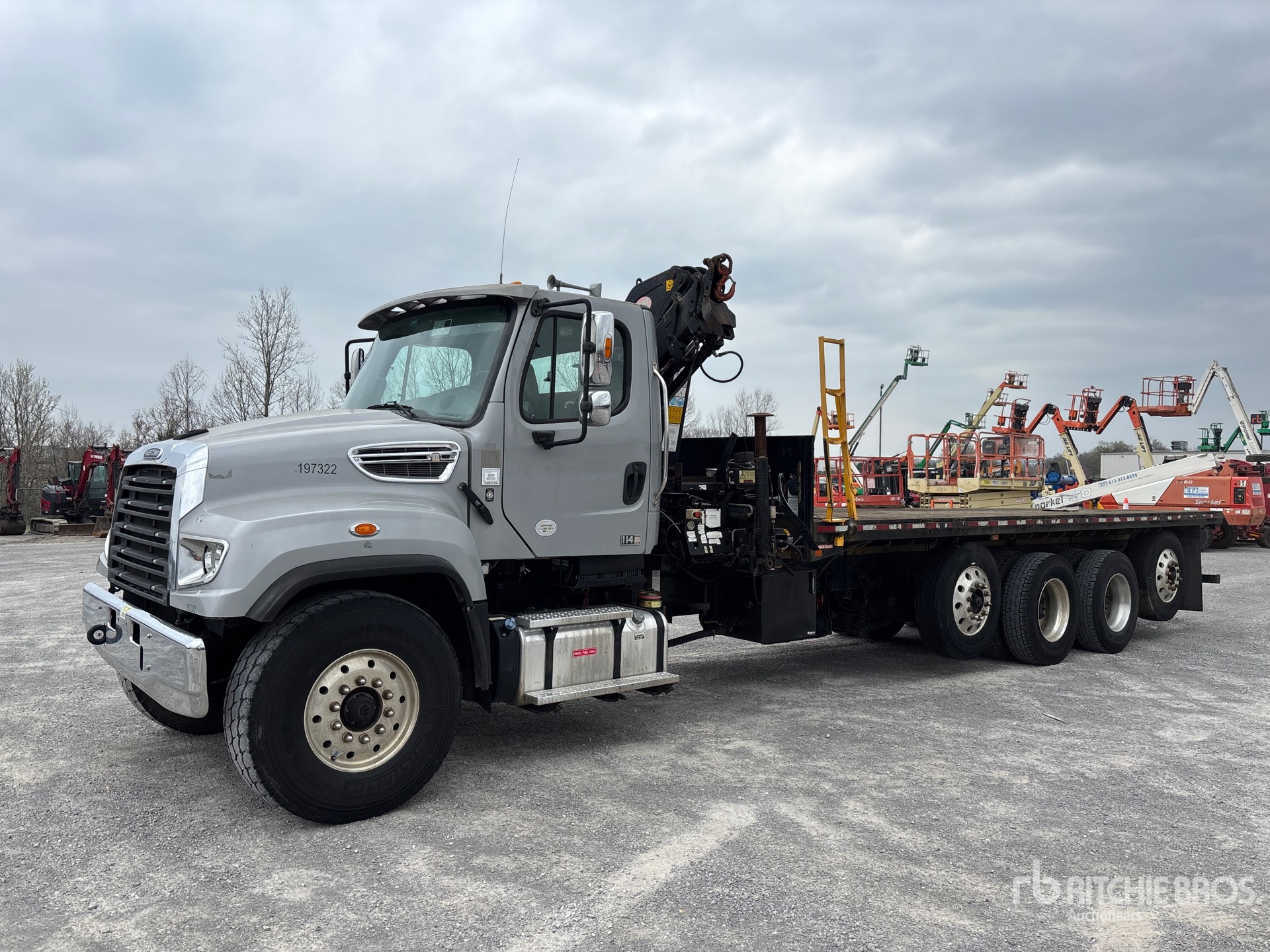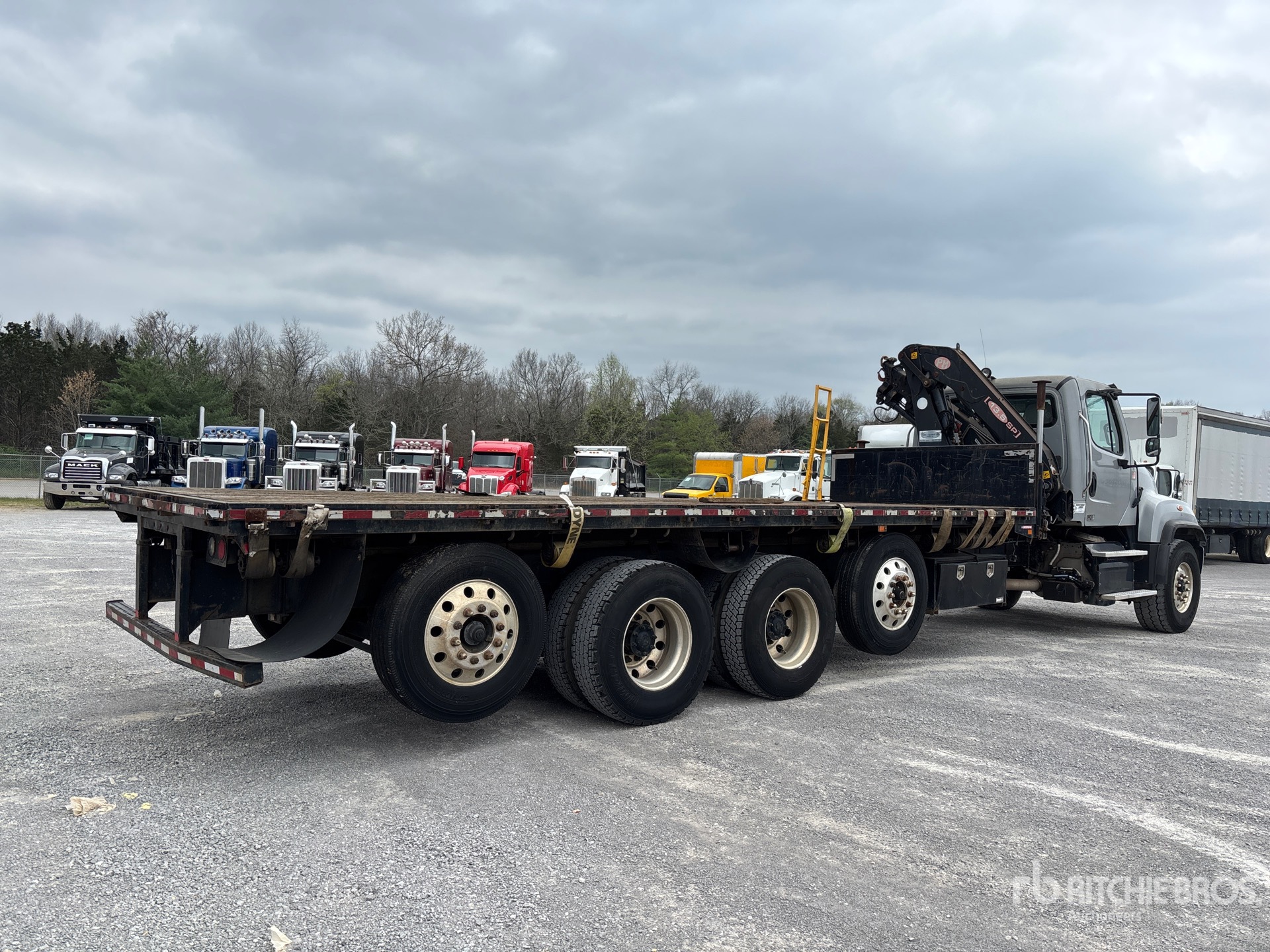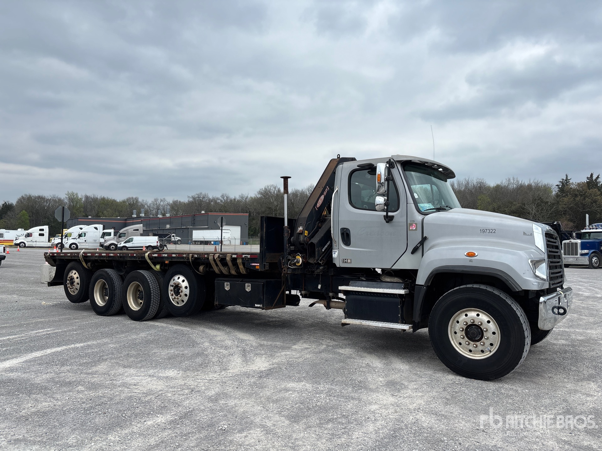 Detroit DD13 6 Cylinder 12.8 L Diesel 410 hp Engine, 2017 US EPA Label, Requires Diesel Exhaust Fluid, 5523 Engine hrs, Engine Brake, Eaton Fuller FRO-16210C 10-Speed Manual Transmission, 12350 lb Front Axle, 46000 lb Rears, 3.58:1 Axle Ratio, 80000 lb GVWR, 425/65R22.5 Front Tires, 11R22.5 Rear Tires, Dual Steering Boxes, Airliner Air Ride Suspension, 293 in Wheelbase, PTO, 7 ft - 26 ft 4 Section Boom, Straight Down Outriggers, PM Series 13 SP 10140 lb 4 Section Hydraulic Crane, 24 ft x 96 in Bed, Professionally-Maintained-Fleet-Vehicle-PAG