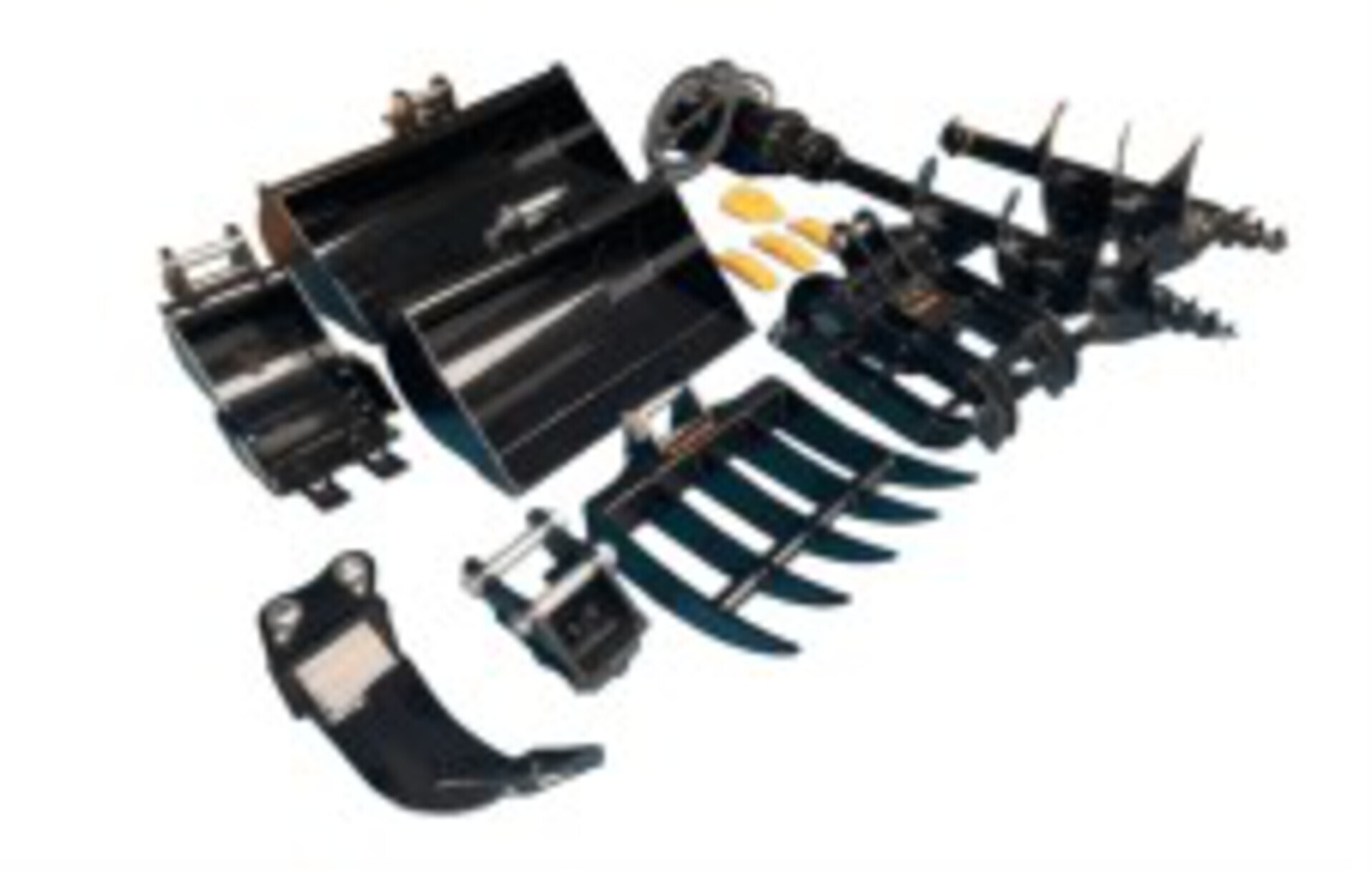 (1) 8 in Bucket, (1) 24 in Bucket, (1) 32 in Bucket, (1) Auger w/ 8 in & 12 in Bits, (1) Quick Coupler, (1) Rake, (1) Ripper, (1) Grapple, (1) Set of Bucket Teeth w/ Side Cutter, Product images displayed are stock photos. Item is new/unused.