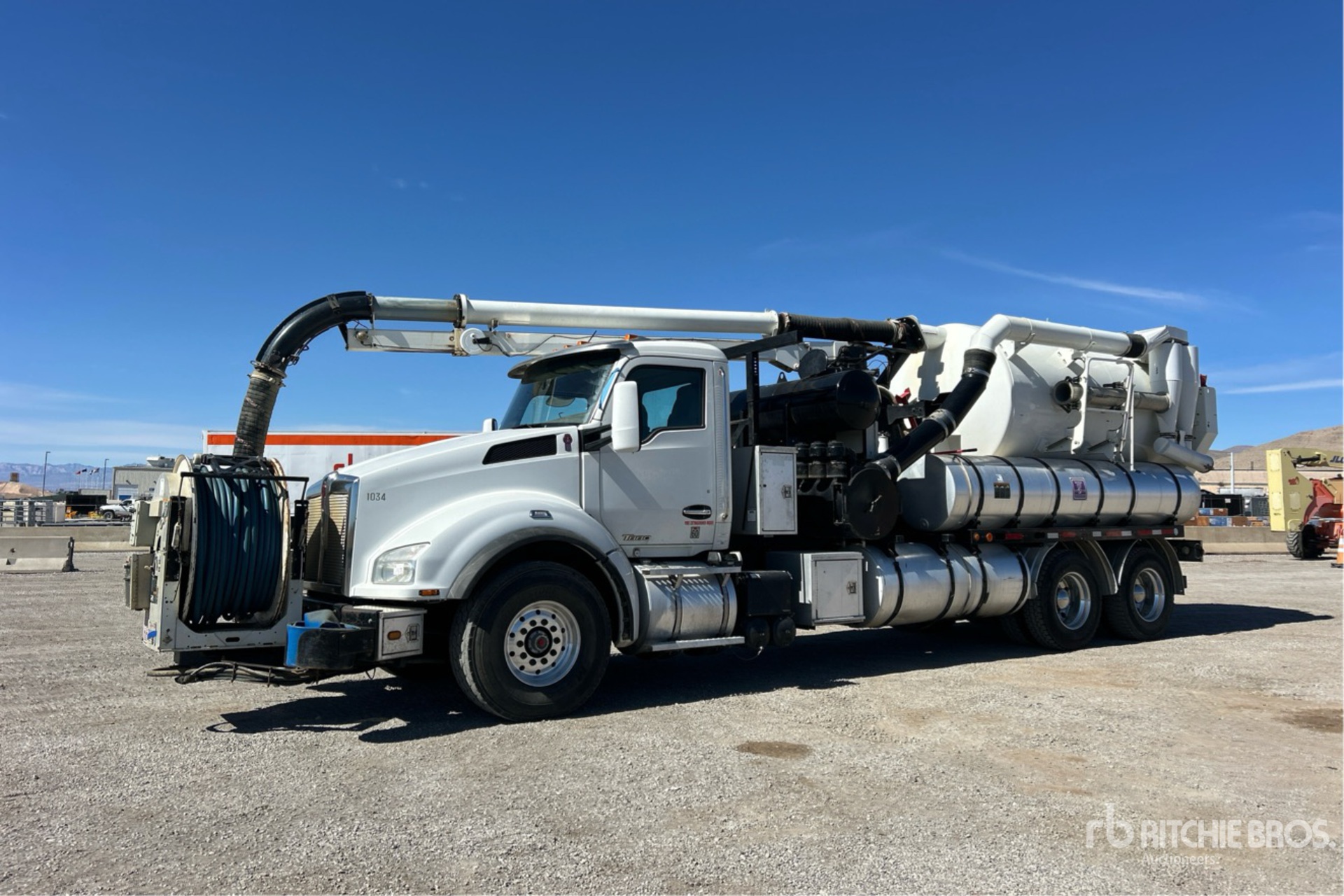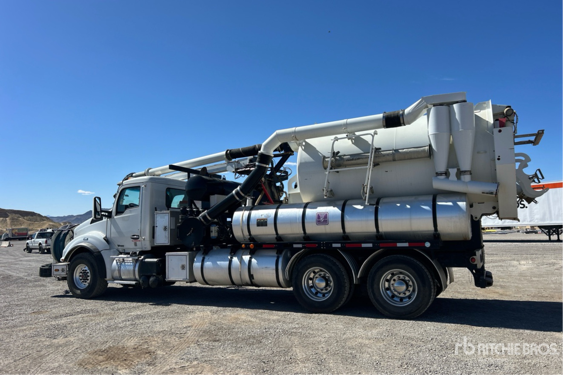 Cummins ISX12 6 Cylinder 11.9 L Diesel 425 hp Engine, 2017 US EPA Label, Requires Diesel Exhaust Fluid, 9632 Engine hrs, Engine Brake, Allison 4000RDS Automatic Transmission, 20000 lb Front Axle, 46000 lb Rears, Meritor RT-46-164PEH Drive Axles, 5.38:1 Axle Ratio, 66000 lb GVWR, Air Ride Cab, Aluminum Outer Wheels, 425/65R22.5 Front Tires, 11R22.5 Rear Tires, Dual Steering Boxes, Double Frame, Spring over Walking Beam Suspension, 272 in Wheelbase, PTO, Steel Debris Tank, Front Hose Reel, Fresh Water Tank, Hydraulic Lift Tailgate, Hydraulic Tailgate Locks, Telescopic Boom, 8 in Suction Hose, Hydraulic Driven Pump, Roots 824RCSV18BLK Blower, Cordless Remote Control